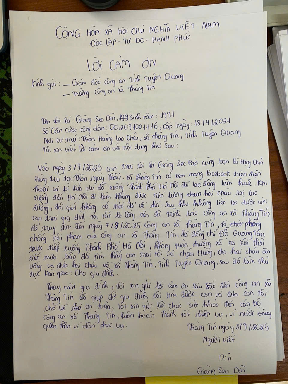 Gia đình ông Giàng Seo Dìn, trú tại thôn Hoàng Lao Chải, xã Thàng Tín, tỉnh Tuyên Quang gửi lời cảm ơn sâu sắc tới Giám đốc Công an tỉnh Tuyên Quang, Công an xã Thàng Tín vì đã vào cuộc kịp thời, tìm và đưa được 02 cháu đi lạc về với gia đình.