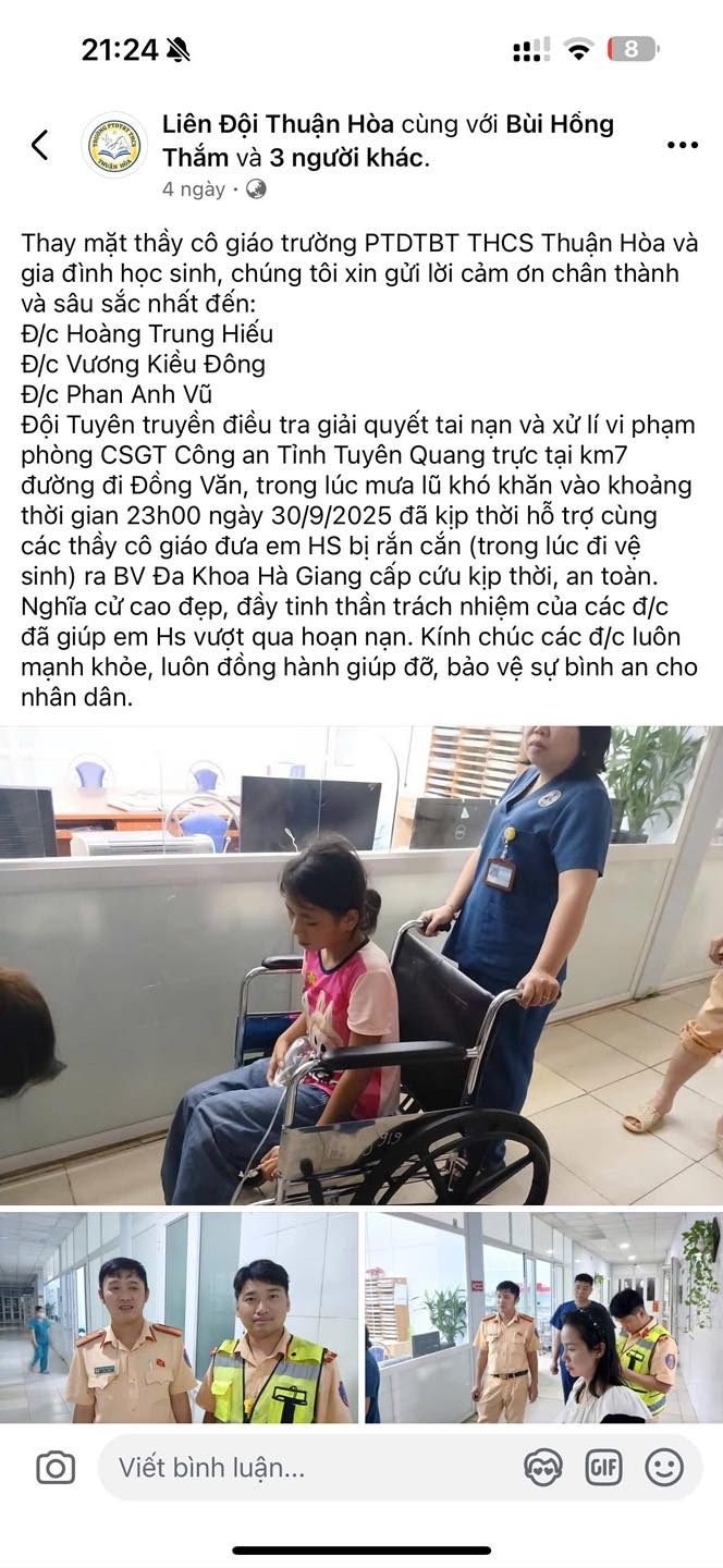 Trong những ngày mưa lũ hoành hành ở Hà Giang, khi nước tràn ngập từng con ngõ nhỏ, chia cắt bao mái nhà, giữa dòng nước đục ngầu ấy vẫn sáng lên hình ảnh những người chiến sĩ công an lặng lẽ vượt hiểm nguy, mang từng gói mì, từng chai nước đến với dân. Giữa họ, nổi bật là hình ảnh Thượng tá Hoàng Văn Thìn – Trưởng Công an phường Hà Giang 2, người đã không quản hiểm nguy, bì bõm lội qua dòng nước xiết để cứu trợ, sẻ chia cùng bà con.
