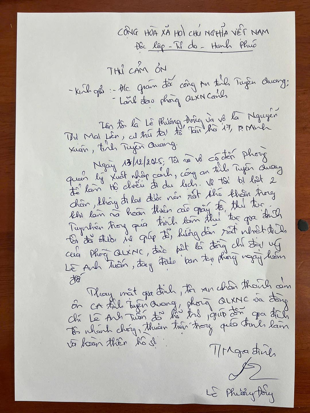Công an tỉnh Tuyên Quang vừa nhận được lá thư của gia đình anh Lê Phương Đông và chị Nguyễn Thị Mai Liên, trú tại phường Minh Xuân, tỉnh Tuyên Quang, cảm ơn về sự hỗ trợ, giúp đỡ nhiệt tình của cán bộ chiến sĩ Phòng Quản lý xuất nhập cảnh, Công an tỉnh trong giải quyết thủ tục hành chính nhanh gọn, tạo thuận lợi cho người dân.
