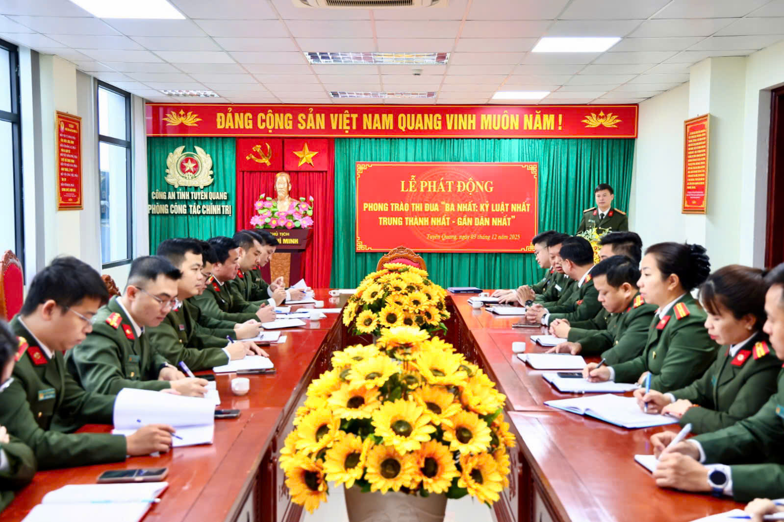 Thiết thực hưởng ứng Lễ phát động Phong trào thi đua đặc biệt “Ba nhất: Kỷ luật nhất - Trung thành nhất - Gần dân nhất” do Bộ Công an và Giám đốc Công an tỉnh phát động, ngày 3/12/2025, Phòng Công tác Chính trị Công an tỉnh Tuyên Quang đã tổ chức lễ phát động, triển khai sâu rộng phong trào đến toàn thể cán bộ, chiến sĩ trong đơn vị.