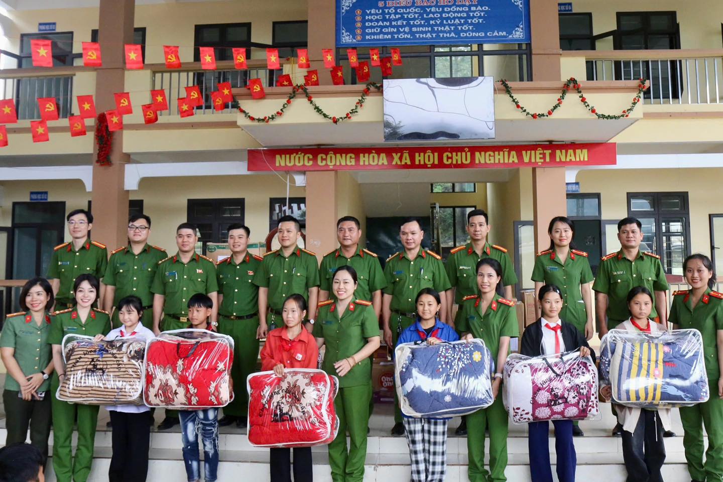 Tại đây, đoàn công tác đã trao tặng nhiều phần quà ý nghĩa cho hơn 500 em học sinh, gồm lương thực, quần áo, chăn ấm, đồ dùng học tập, máy lọc nước và tiền mặt – thể hiện tấm lòng sẻ chia, tinh thần vì cộng đồng của lực lượng Công an.