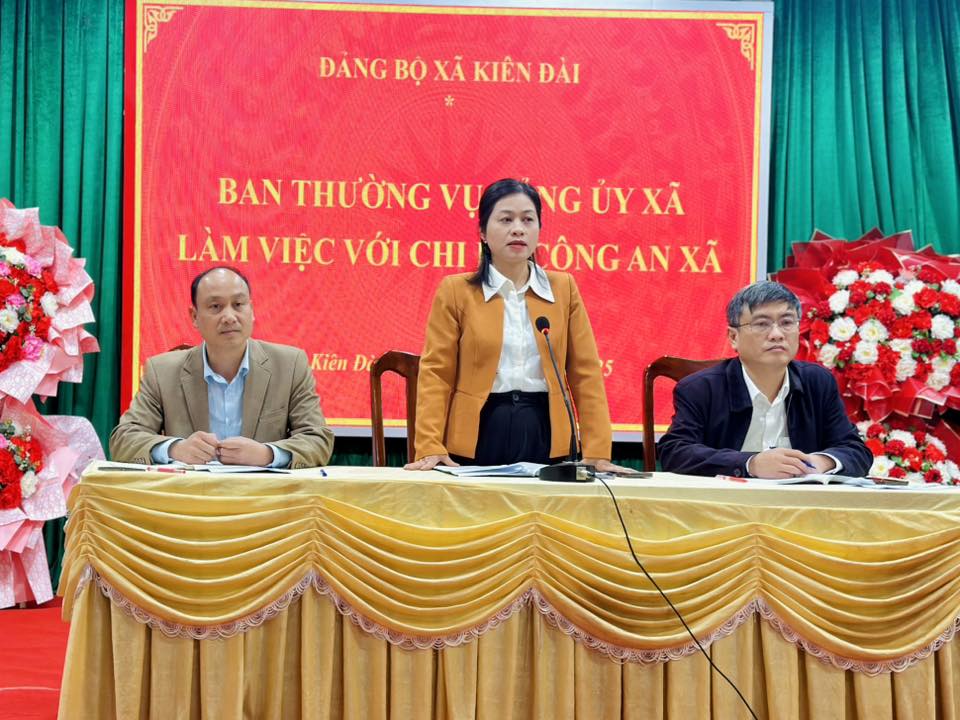 Phát biểu kết luận buổi làm việc, đồng chí Lâm Thị Hồng Ngân, Bí thư Đảng uỷ, Chủ tịch Hội đồng nhân dân xã ghi nhận, biểu dương và đánh giá cao những thành tích, kết quả mà lực lượng Công an xã đã đạt được. Đồng thời, đồng chí Bí thư Đảng uỷ xã chỉ đạo Chi bộ Công an xã tiếp tục phát huy vai trò nòng cốt trong công tác đảm bảo an ninh trật tự; bám sát các chỉ đạo của cấp ủy, chính quyền địa phương; nâng cao tinh thần trách nhiệm, kỷ luật, kỷ cương; chủ động nắm chắc tình hình cơ sở, kịp thời tham mưu cho Đảng ủy, UBND xã trong công tác bảo đảm an ninh trật tự, nhất là dịp Tết Nguyên đán sắp tới; chuẩn bị chu đáo, bảo vệ tuyệt đối an ninh, an toàn Đại hội lần thứ XIV của Đảng và cuộc bầu cử đại biểu Quốc hội và đại biểu Hội đồng nhân dân các cấp.