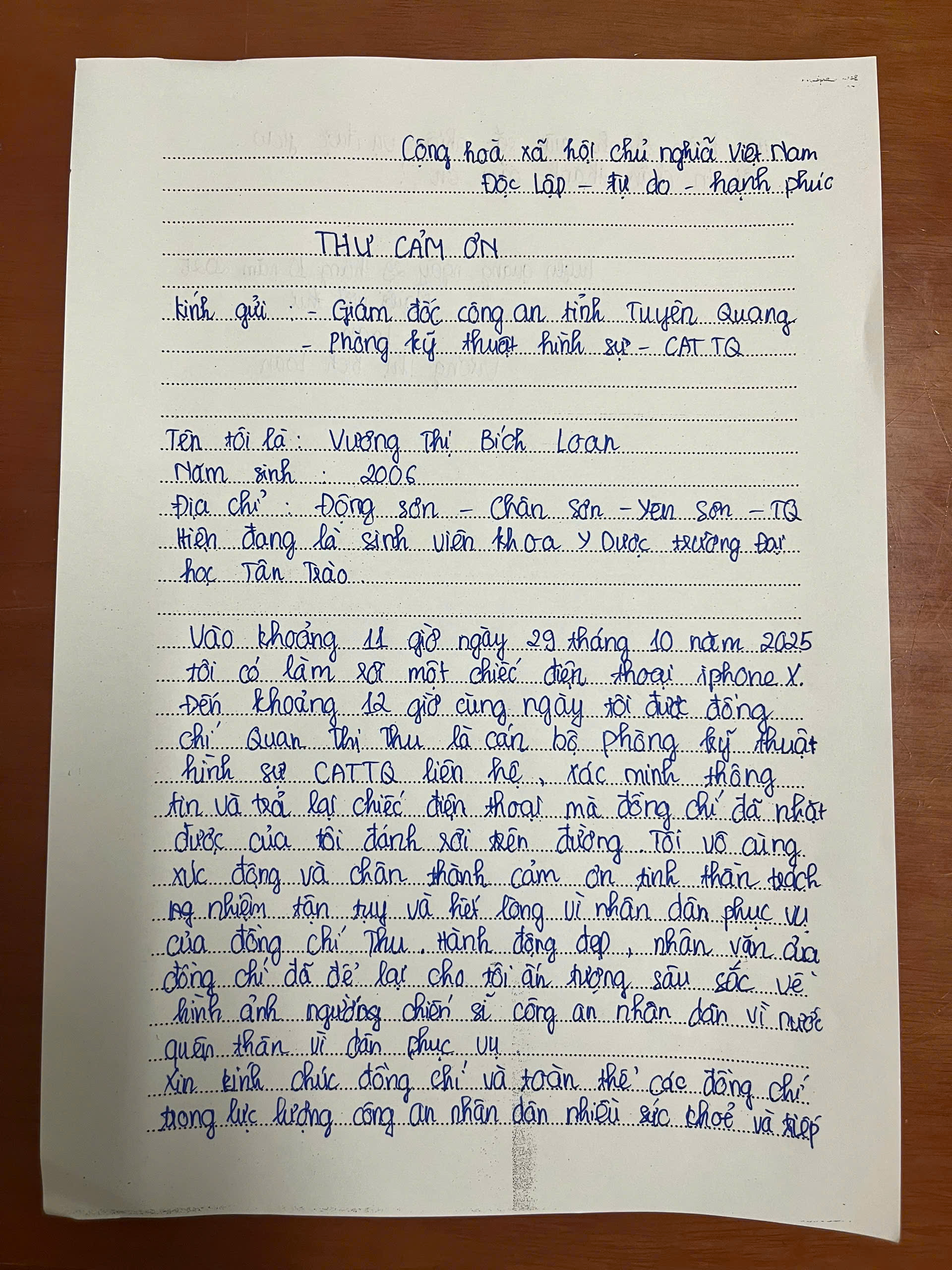 Trước đó, vào khoảng 11 giờ ngày 29/10/2025, chị Vương Thị Bích Loan trên đường di chuyển tại khu vực phường Minh Xuân, tỉnh Tuyên Quang có đánh rơi 01 chiếc điện thoại, nhãn hiệu Iphone X. Đến khoảng 12 giờ cùng ngày, chị Loan được đồng chí Quan Thị Thu, cán bộ Phòng Kỹ thuật hình sự liên hệ, xác minh thông tin và trao trả lại chiếc điện thoại đồng chí nhặt được của chị Loan bị rơi trên đường.