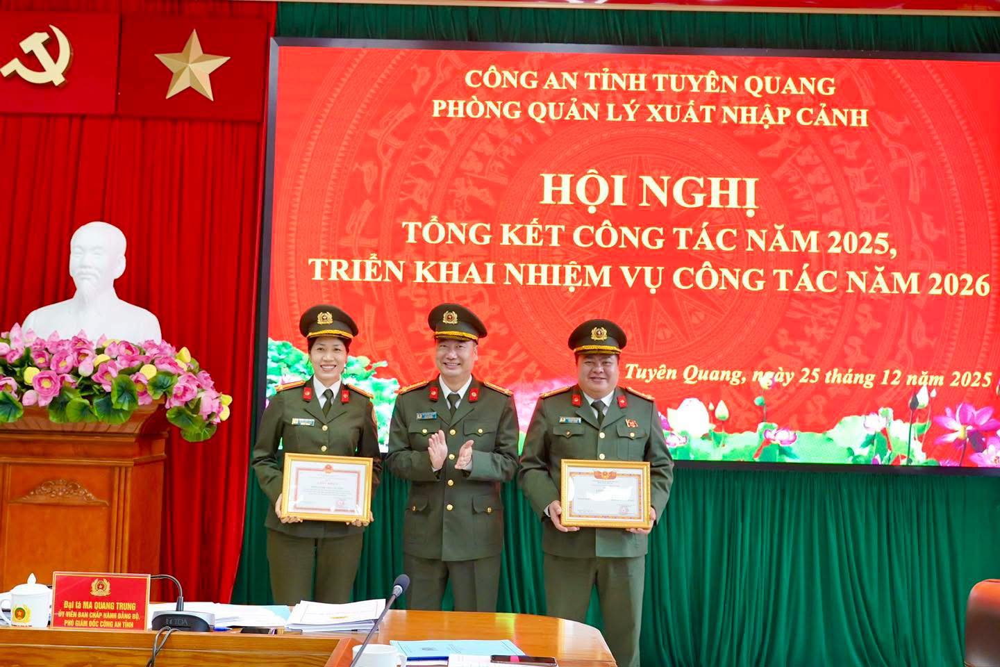 Cùng ngày, Phòng Quản lý xuất nhập cảnh tổ chức Hội nghị tổng kết công tác năm 2025 và triển khai chương trình công tác năm 2026. Đồng chí Đại tá Ma Quang Trung, Uỷ viên BCH Đảng bộ, Phó Giám đốc Công an tỉnh dự và chỉ đạo hội nghị. Năm 2025, Phòng Quản lý xuất nhập cảnh đã tập trung tham mưu, thực hiện tốt công tác quản lý nhà nước về lĩnh vực xuất, nhập cảnh trên địa bàn, được Đảng ủy, lãnh đạo Công an tỉnh, cấp uỷ, chính quyền địa phương, cơ quan, tổ chức và người dân ghi nhận, đánh giá cao.