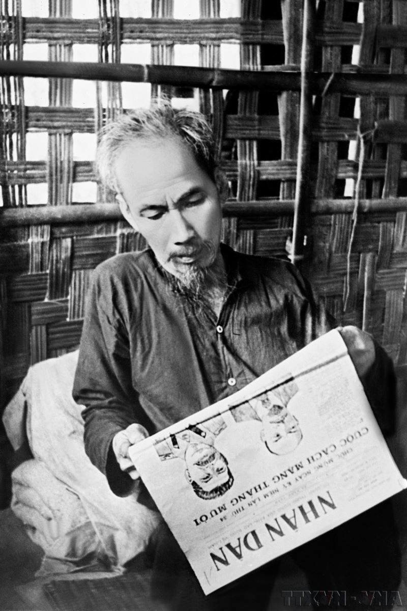 Chủ tịch Hồ Chí Minh là độc giả tích cực của báo chí trong nước và thế giới. Bác tự rèn mình một phong cách đọc báo đều đặn, nghiêm túc. Bác không hẹn tiếp khách vào đầu giờ làm việc hàng ngày, giờ đó việc đầu tiên là Người xem qua các báo. Trong ảnh: Bác Hồ đọc báo Nhân Dân ở chiến khu Việt Bắc (1951). Ảnh: TTXVN