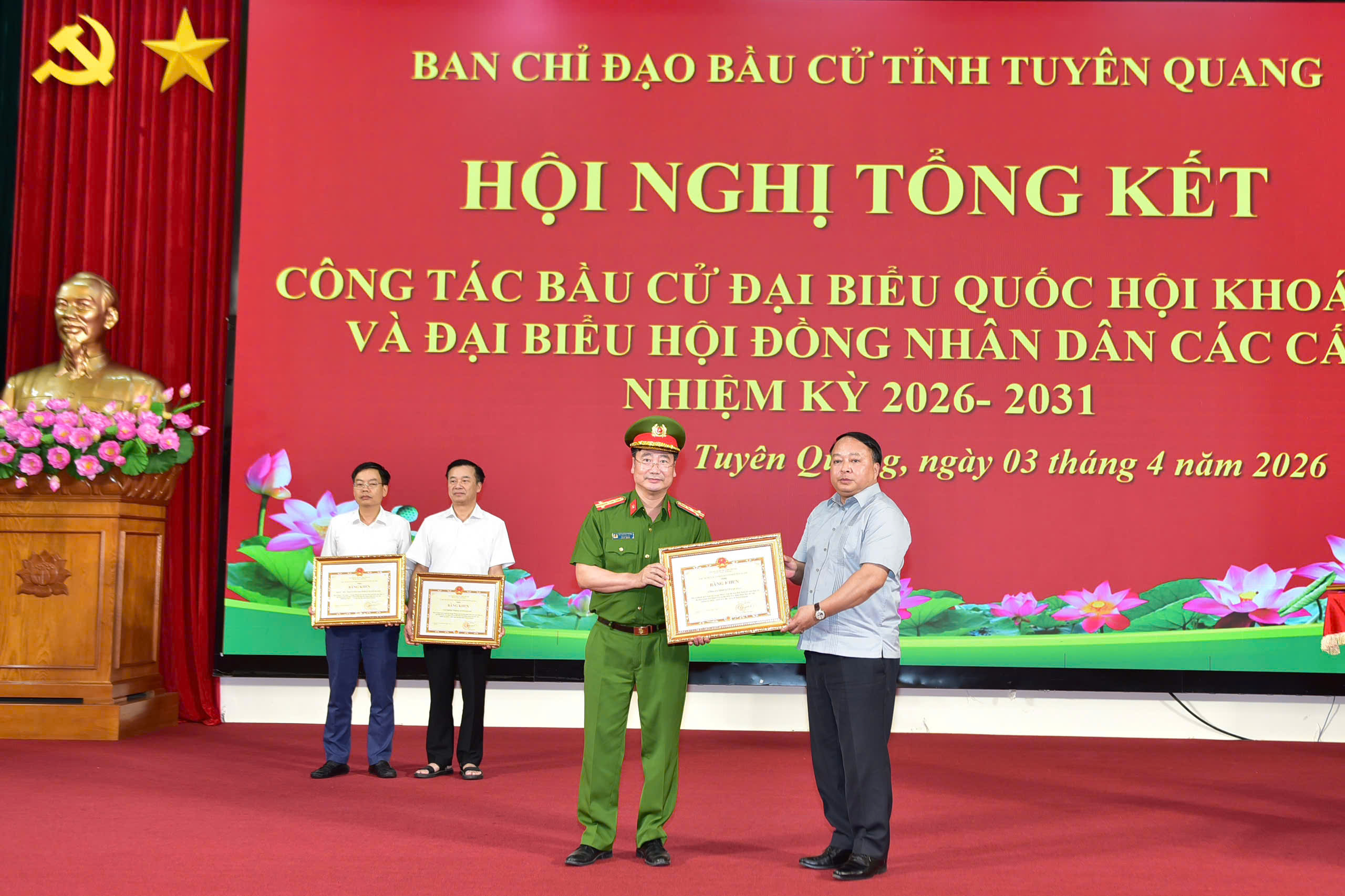 Cuộc bầu cử đại biểu Quốc hội khóa XVI và đại biểu Hội đồng nhân dân các cấp nhiệm kỳ 2026-2031 trên địa bàn tỉnh Tuyên Quang đã được tổ chức thành công tốt đẹp, bảo đảm dân chủ, đúng pháp luật, an toàn, tiết kiệm và đúng tiến độ. Nhân dịp này, UBND tỉnh đã khen thưởng 121 tập thể và 37 cá nhân đã có thành tích xuất sắc trong Phong trào thi đua thực hiện tốt cuộc bầu cử đại biểu Quốc hội khóa XVI và đại biểu HĐND các cấp nhiệm kỳ 2026-2031. Công an tỉnh Tuyên Quang vinh dự có 03 tập thể, 01 cá nhân được Chủ tịch UBND tỉnh tặng Bằng khen, trong đó có Công an tỉnh Tuyên Quang, phòng An ninh chính trị nội bộ, phòng Hồ sơ nghiệp vụ, Thiếu tướng Nguyễn Đức Thuận, Uỷ viên Ban Thường vụ Tỉnh uỷ, Giám đốc Công an tỉnh.