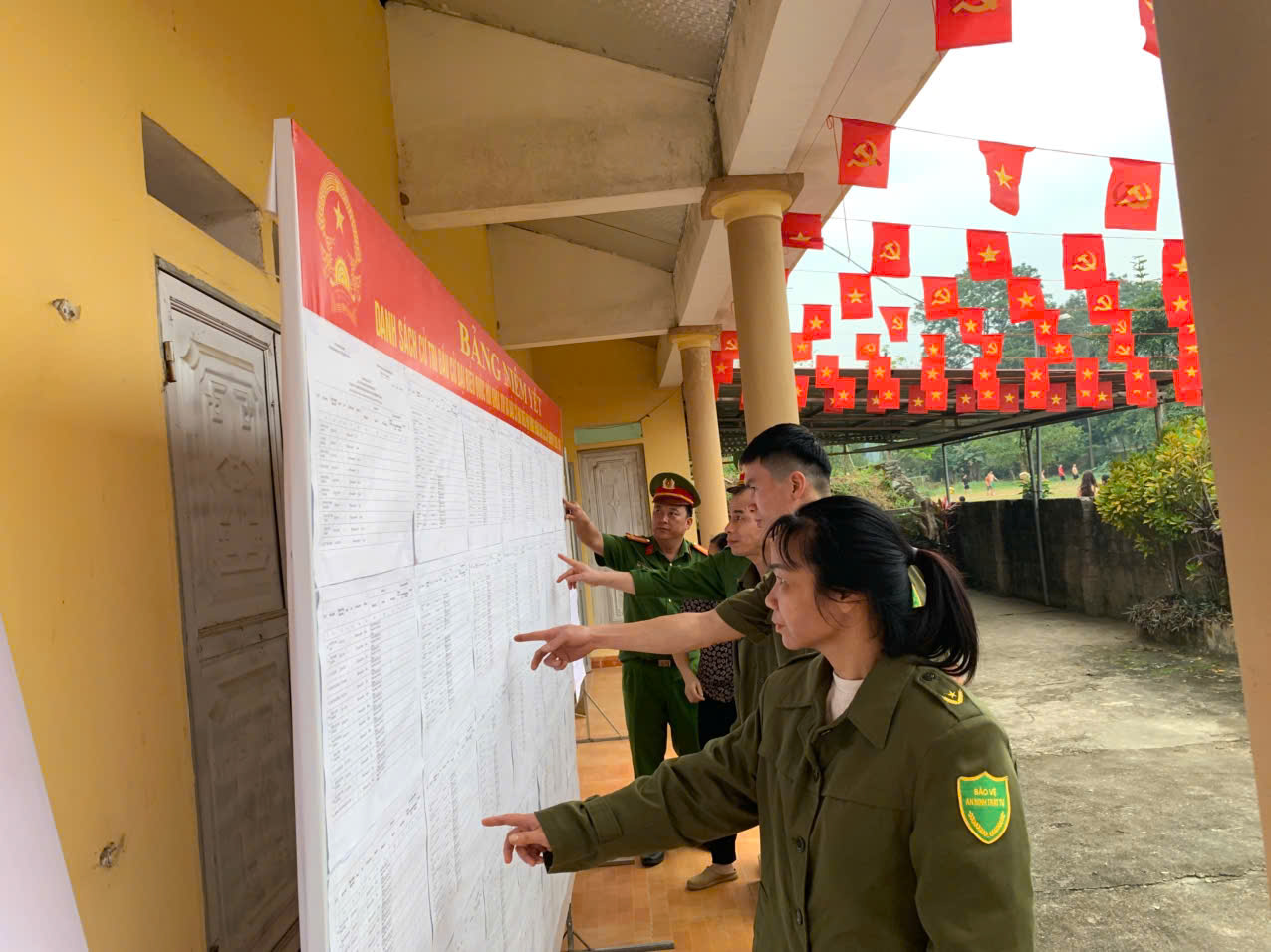 Bên cạnh đó, cán bộ, chiến sĩ Công an xã đã phối hợp với cấp ủy, chính quyền địa phương, các ban, ngành, đoàn thể và lực lượng an ninh cơ sở tham gia chỉnh trang khu vực bỏ phiếu, vệ sinh môi trường, treo cờ Tổ quốc, băng rôn, khẩu hiệu tuyên truyền. Hình ảnh các cán bộ, chiến sĩ trực tiếp trèo thang treo cờ, dựng pano, cùng Nhân dân dọn dẹp, sắp xếp khu vực bỏ phiếu đã góp phần tạo nên không khí trang nghiêm, phấn khởi, hướng tới ngày bầu cử.