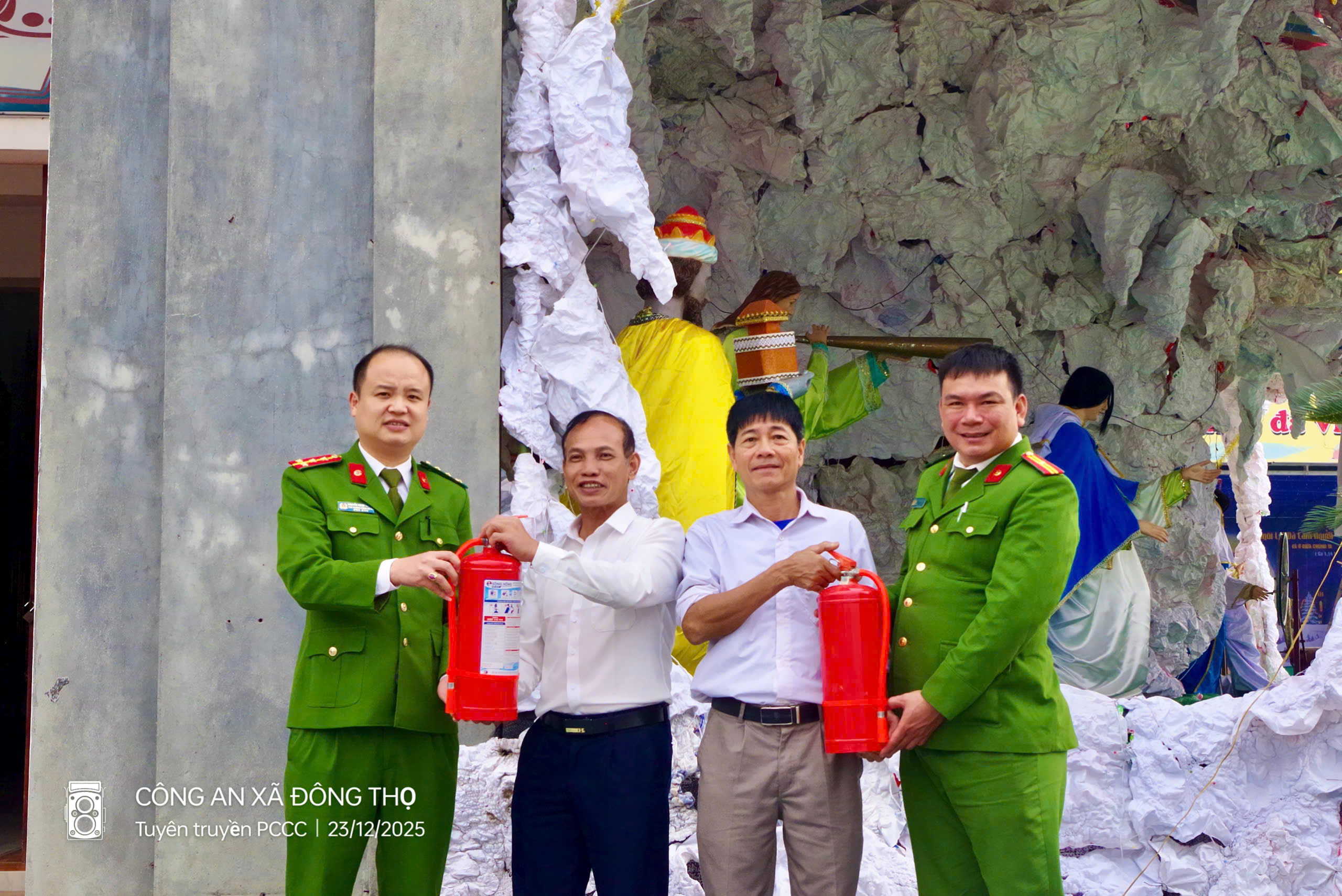 Tại buổi làm việc, Công an xã đã trao tặng bình chữa cháy xách tay, đồng thời phổ biến kiến thức, kỹ năng cơ bản về phòng cháy, chữa cháy và cứu nạn, cứu hộ, tập trung vào các nội dung thiết thực như: Nhận diện các nguy cơ cháy, nổ thường gặp trong dịp Noel (hệ thống điện trang trí, đèn, nến…); Biện pháp phòng ngừa cháy, nổ tại cơ sở thờ tự; Hướng dẫn sử dụng bình chữa cháy đúng cách; Kỹ năng xử lý tình huống khi xảy ra cháy ban đầu và thoát nạn an toàn.