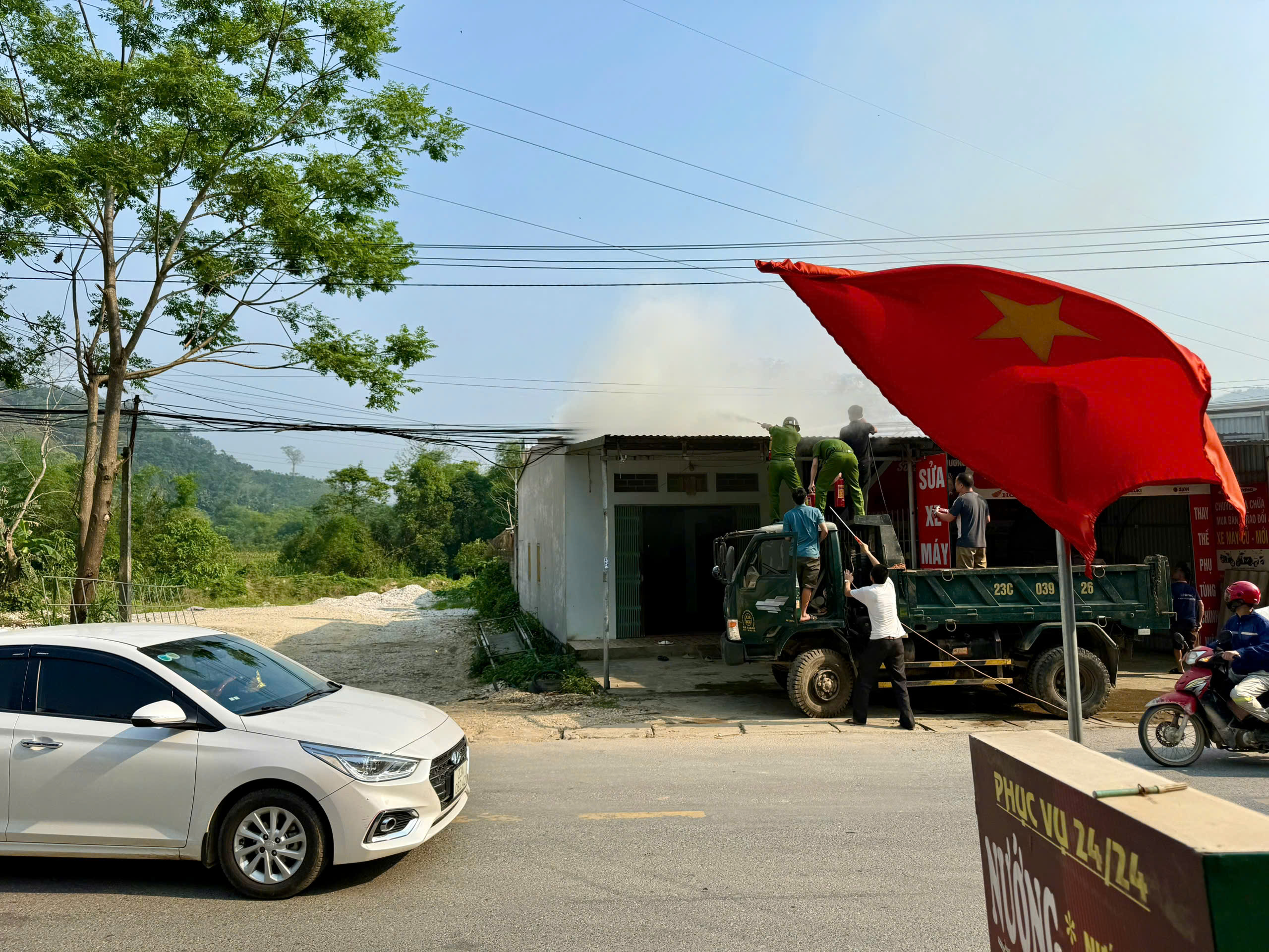 Tại hiện trường, đám cháy bùng phát, khói lửa lan nhanh do gặp vật liệu dễ cháy và điều kiện thời tiết hanh khô. Lực lượng Công an xã đã phối hợp với lực lượng bảo vệ an ninh trật tự cơ sở và nhân dân xung quanh sử dụng các phương tiện tại chỗ như bình chữa cháy, máy bơm nước, dụng cụ thủ công để khống chế ngọn lửa; đồng thời tổ chức phân luồng, bảo đảm an toàn giao thông.