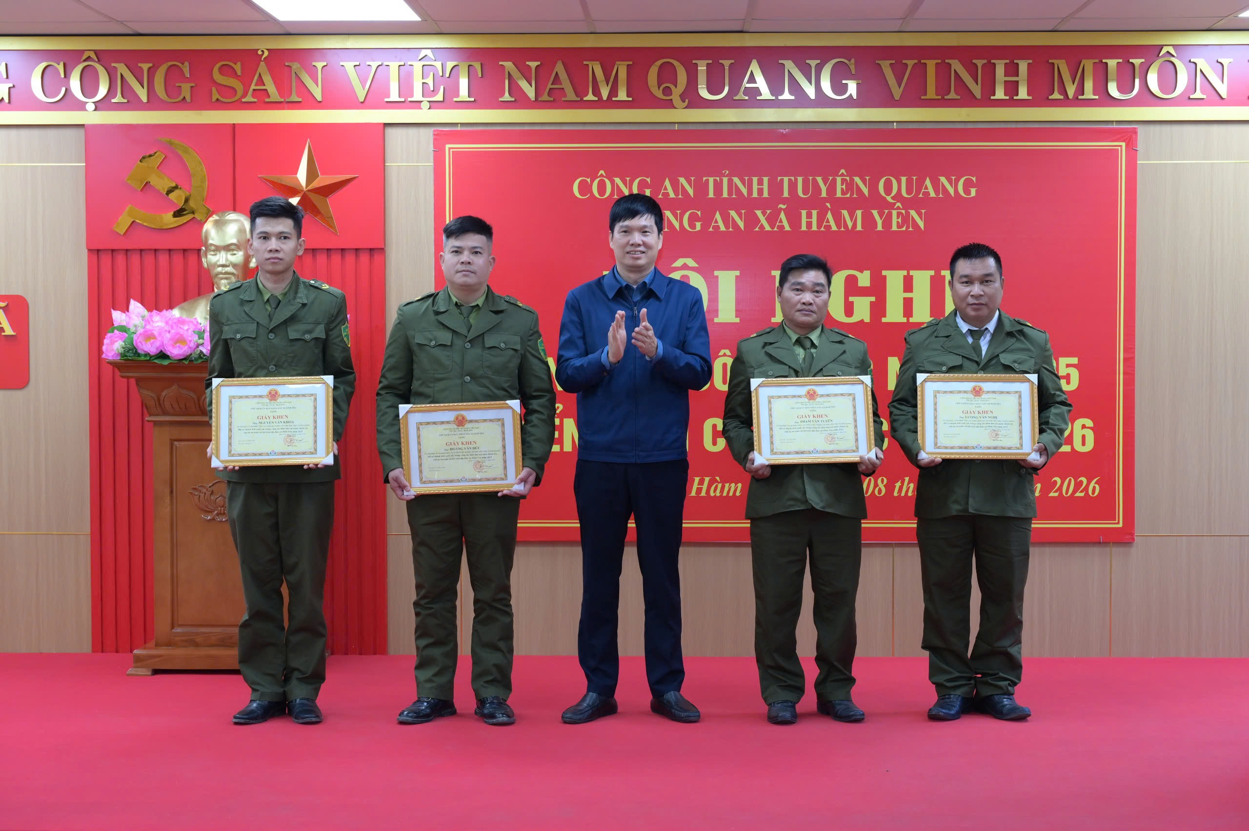 Ghi nhận những thành tích đã đạt được, trong năm 2025, Công an xã Hàm Yên vinh dự được Giám đốc Công an tỉnh Tuyên Quang tặng Giấy khen vì có thành tích xuất sắc trong phong trào thi đua “Vì an ninh Tổ quốc”; 09 cá nhân đạt danh hiệu “Chiến sĩ thi đua cơ sở”, 27 cá nhân đạt danh hiệu “Chiến sĩ tiên tiến”. Nhân dịp này, Chủ tịch UBND xã Hàm Yên đã tặng Giấy khen cho 01 tập thể và 10 cá nhân có thành tích xuất sắc trong công tác bảo đảm an ninh, trật tự, an toàn xã hội trên địa bàn xã năm 2025.