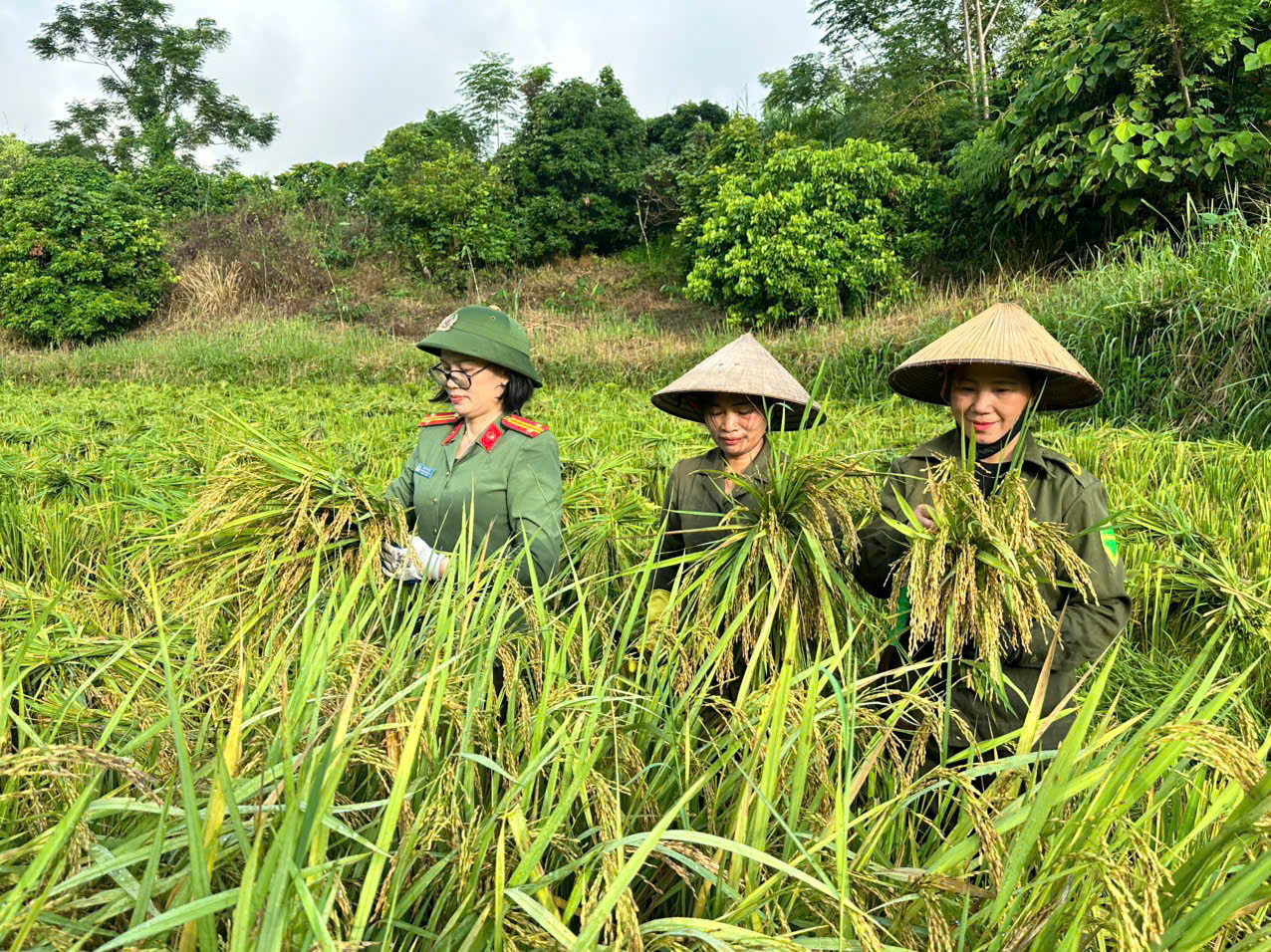 Trước tình hình đó, để giúp gia đình kịp thời vụ, lực lượng Công an xã cùng Tổ ANTT thôn đã tự nguyện xuống đồng, kịp thời hỗ trợ người dân thu hoạch lúa.