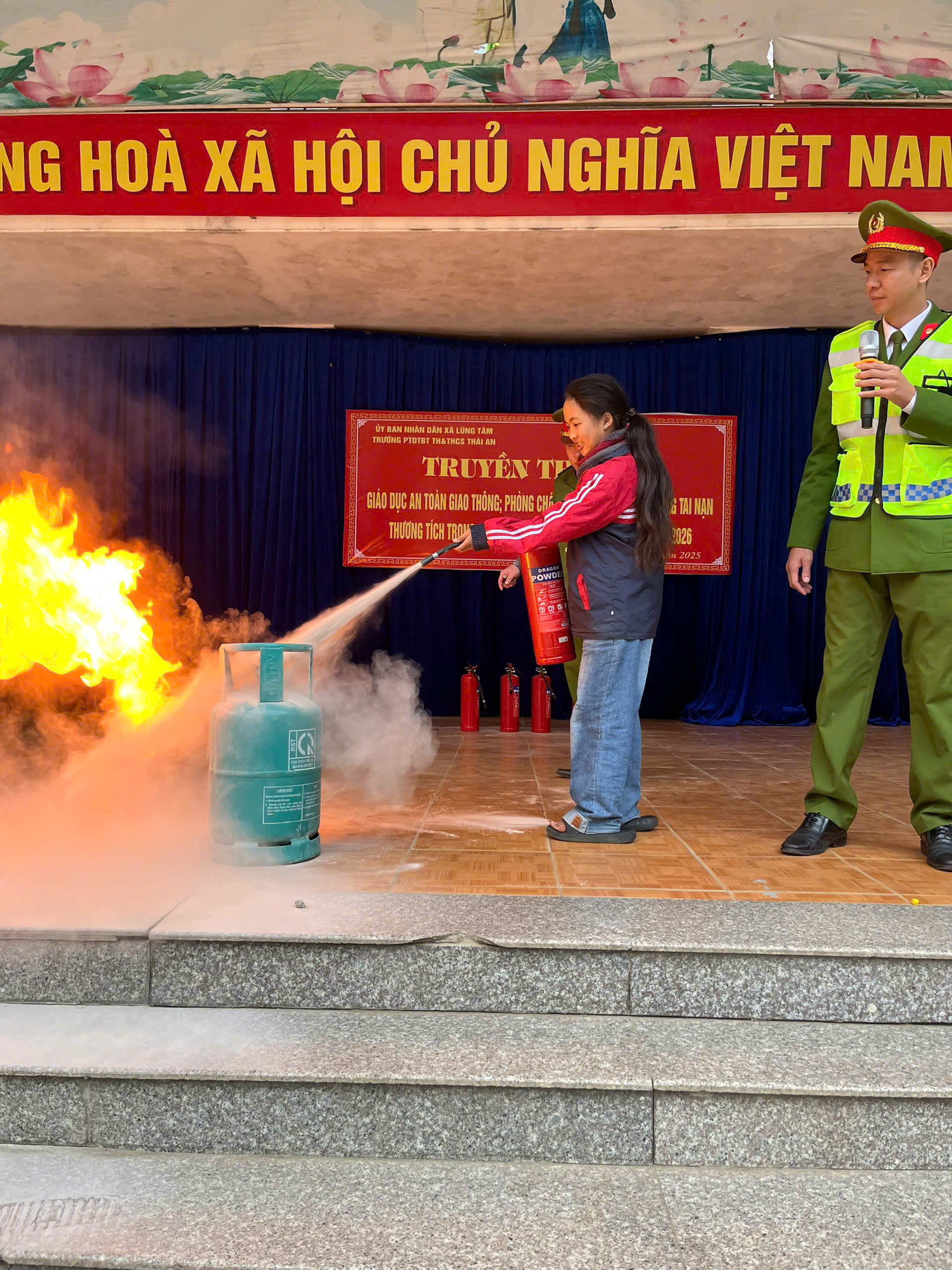 Về phòng cháy chữa cháy (PCCC), lực lượng Công an xã đã tập trung tuyên truyền về nguyên nhân cháy nổ trong trường học và gia đình; hướng dẫn kỹ năng thoát hiểm, xử lý tình huống khẩn cấp và cách sử dụng phương tiện chữa cháy tại chỗ (bình chữa cháy xách tay) theo nguyên tắc "Rút - Hướng - Bóp - Quét"; hướng dẫn liên hệ số điện thoại khẩn cấp.