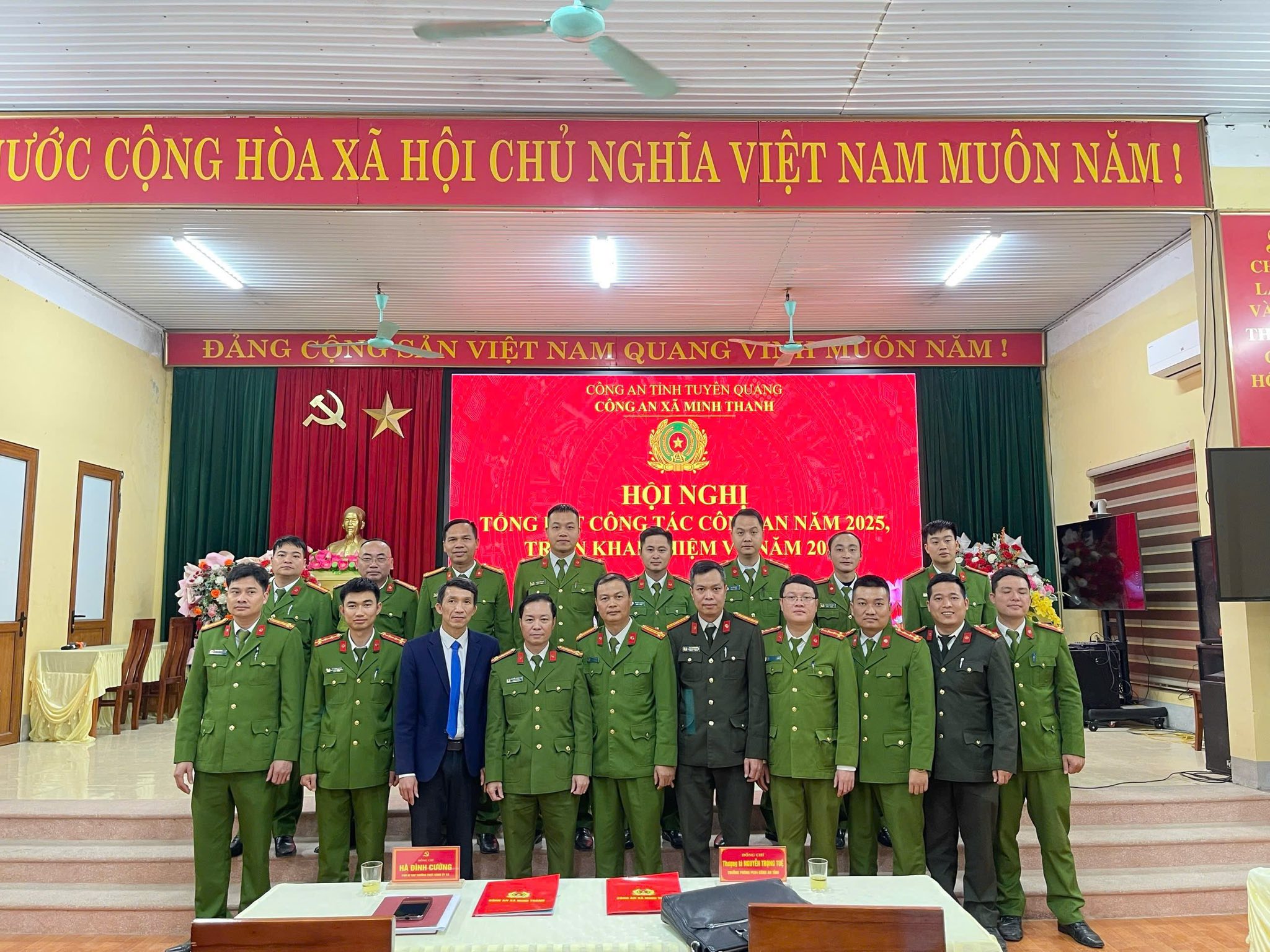 Tại Hội nghị, đồng chí Thượng tá Nguyễn Trọng Tuệ, Trưởng Phòng Cảnh sát ĐTTP về ma túy, Công an tỉnh và đồng chí Hà Đình Cường, Phó Bí thư Thường trực Đảng uỷ xã đã biểu dương kết quả Công an xã đã đạt được trong năm vừa qua; đặc biệt là sau khi hợp nhất, sáp nhập hành chính đơn vị các cấp và đề nghị lực lượng Công an xã tiếp tục phát huy vai trò tiên phong, gương mẫu trong triển khai các chủ trương, định hướng của Bộ Công an, Công an tỉnh; kịp thời tham mưu cấp uỷ, chính quyền địa phương các chủ trương, biện pháp nhằm giữ vững ổn định chính trị, an ninh trật tự, tấn công trấn áp các loại tội phạm; thực hiện có hiệu quả phong trào thi đua “Ba nhất”. Thời gian trước mắt từ nay đến hết quý I/2026, tập trung lực lượng, xây dựng các phương án, kế hoạch bảo vệ tuyệt đối an ninh an toàn Đại hội đại biểu toàn quốc lần thứ XIV của Đảng và bầu cử đại biểu Quốc hội khoá XVI, đại biểu HĐND các cấp nhiệm kỳ 2026-2031; đảm bảo cuộc sống bình yên của nhân dân.