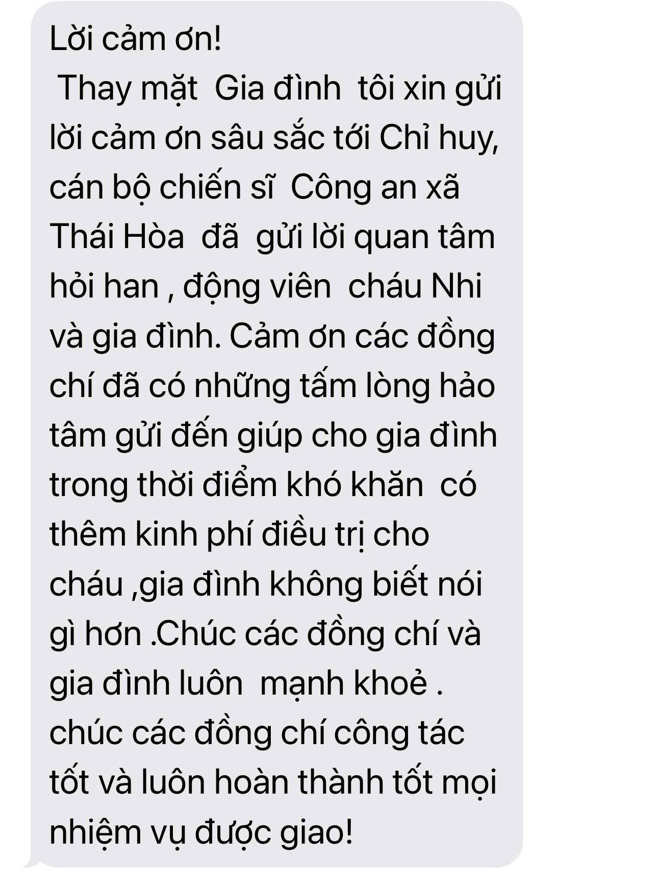 Chia sẻ với hoàn cảnh của gia đình và phát huy tinh thần tương thân tương ái, ngày 28/10/2025 Công an xã Thái Hoà đã tổ chức quyên góp, ủng hộ. Tại buổi quyên góp, 100% cán bộ, chiến sĩ Công an xã đã tham gia đóng góp ủng hộ được 4,5 triệu đồng, số tiền đóng góp đã được gửi đến gia đình cháu Nhi nhằm chia sẻ phần nào khó khăn, giúp cháu sớm ổn định sức khỏe và tiếp tục học tập.