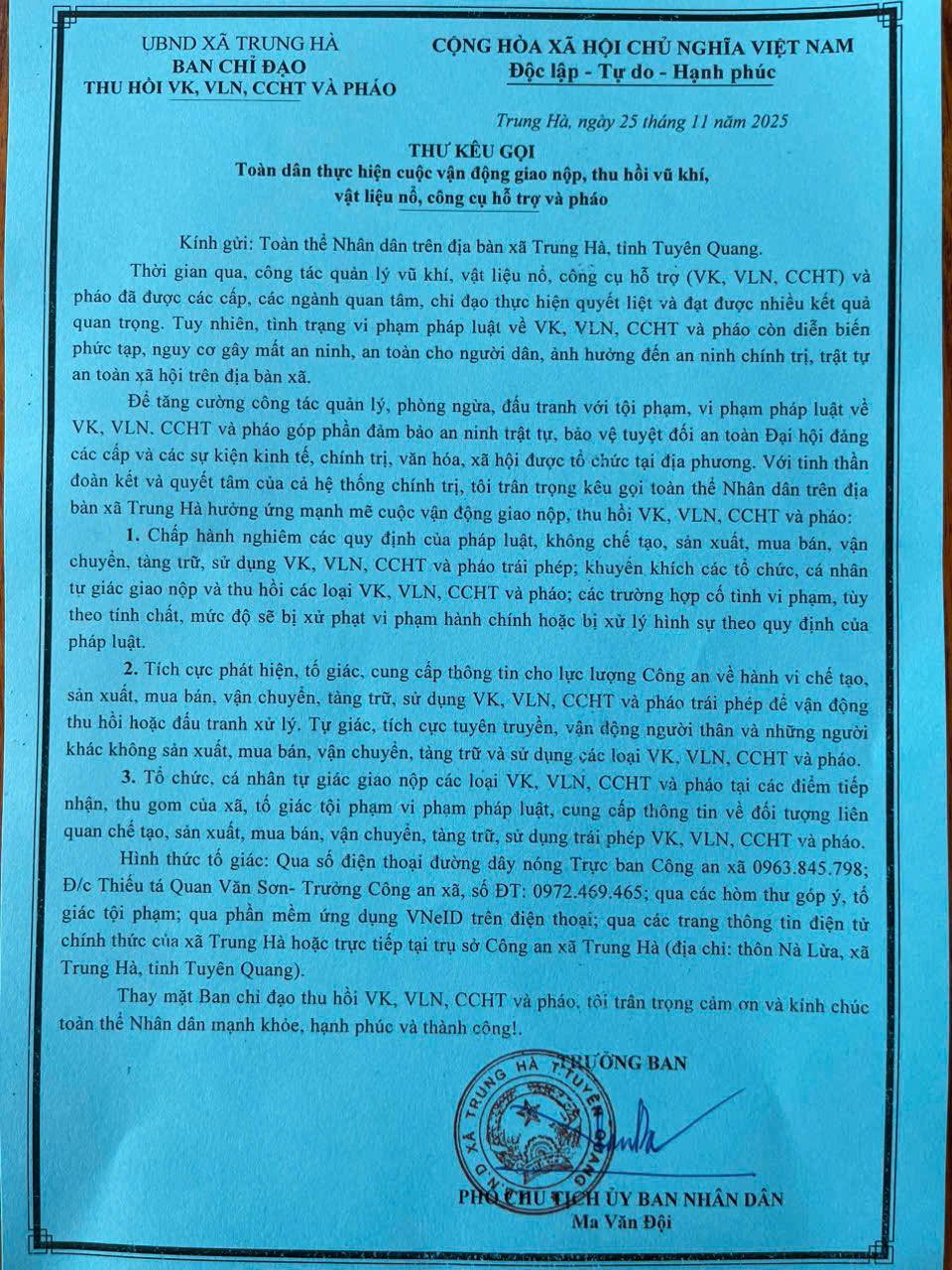 Địa điểm giao nộp: Trụ sở Công an xã Trung Hà (thôn Nà Lừa, xã Trung Hà, tỉnh Tuyên Quang).