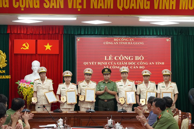 Ngày 20/6/2025, Công an tỉnh Hà Giang tổ chức hội nghị công bố quyết định của Giám đốc Công an tỉnh về việc nghỉ hưu trước hạn tuổi phục vụ cao nhất đối với các đồng chí lãnh đạo, chỉ huy các đơn vị. Dự và chỉ đạo hội nghị có đồng chí Thiếu tướng Nguyễn Đức Thuận, Giám đốc Công an tỉnh; cac đồng chí trong Ban Giám đốc Công an tỉnh; lãnh đạo và cán bộ chiến sĩ các phòng chức năng Công an tỉnh.
