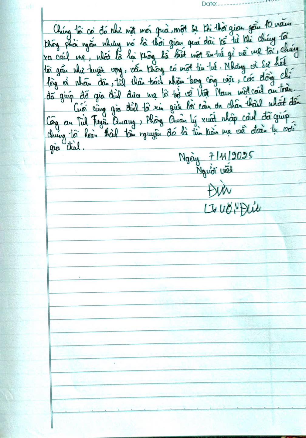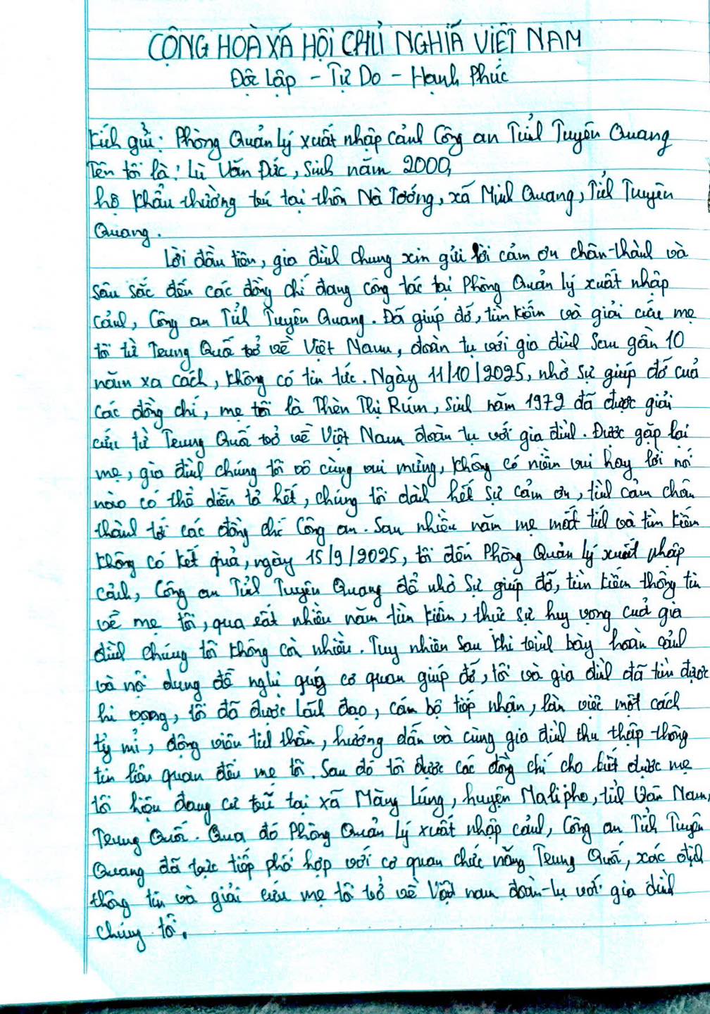 Trước đó, tháng 9/2025, anh Đức trình báo mẹ mình sang Trung Quốc từ năm 2018 và bị mất liên lạc. Ngay khi tiếp nhận thông tin, lực lượng Công an đã nhanh chóng vào cuộc, phối hợp với cơ quan chức năng Trung Quốc xác minh và xác định được bà Rúm đang ở thôn Lầu Thê, hương Mãnh Động, huyện Malypho, tỉnh Vân Nam.