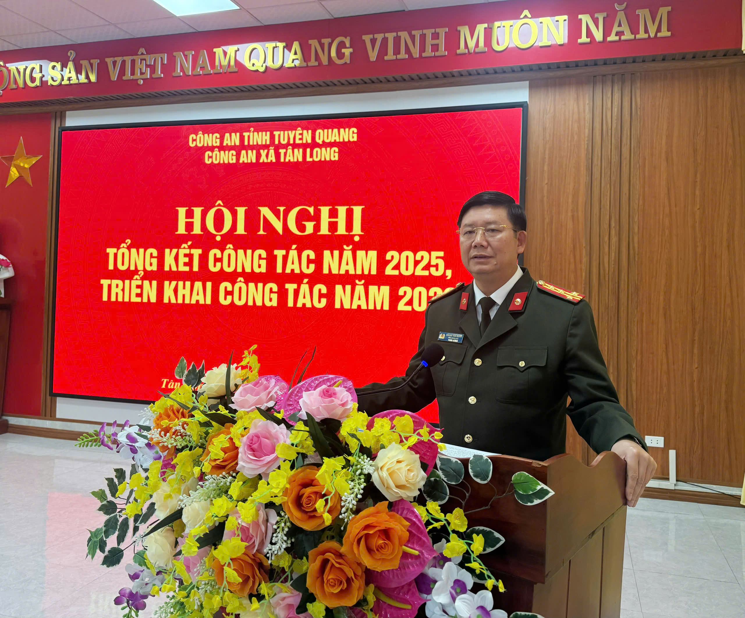 Tại hội nghị, đồng chí Đại tá Hoàng Văn Mạnh, Uỷ viên Ban Thường vụ Đảng uỷ, Phó Giám đốc Công an tỉnh đã phát biểu chỉ đạo, đồng chí ghi nhận những kết quả đạt được của tập thể lãnh đạo, chỉ huy Công an xã Tân Long trong thực hiện các nhiệm vụ công tác năm 2025, đồng thời, đồng chí cũng thẳng thắn chỉ ra các mặt hạn chế, thiếu sót cần tập trung khắc phục, định hướng 09 nhóm nhiệm vụ cần tập trung thực hiện để hoàn thành thắng lợi các mục tiêu, nhiệm vụ được giao trong năm 2026.