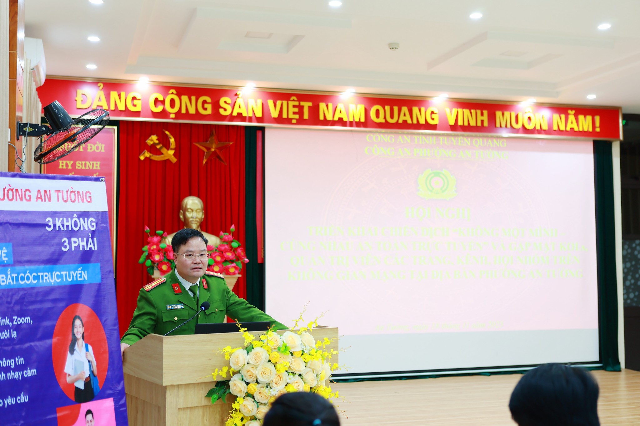 Phát biểu bế mạc Hội nghị, đồng chí Thượng tá Nguyễn Minh Tân, Ủy viên Ban Thường vụ Đảng ủy, Trưởng Công an phường nhấn mạnh: “Chiến dịch "Không một mình - Cùng nhau an toàn trực tuyến" không chỉ là khẩu hiệu tuyên truyền mà còn là cam kết trách nhiệm, là sự chung tay của gia đình, nhà trường, lực lượng Công an, KOLs, quản trị viên các hội, nhóm và toàn xã hội trong việc xây dựng môi trường mạng an toàn, lành mạnh, văn minh, hướng tới thế hệ trẻ, tương lai của đất nước. Lực lượng Công an phường An Tường mong muốn tiếp tục nhận được sự hợp tác, đồng hành, chia sẻ và hỗ trợ từ các cơ quan, đơn vị, các tầng lớp Nhân dân, đặc biệt là các KOLs trong thời gian tới. Đồng chí Trưởng Công an phường khẳng định: Công an phường sẵn sàng hỗ trợ cộng đồng KOLs, quản trị viên các hội, nhóm về mặt pháp lý, nâng cao nhận thức, trách nhiệm trong bảo đảm an ninh, an toàn mạng; đồng thời, chia sẻ, cung cấp thông tin chính thống, kịp thời về các vấn đề đang được quan tâm.
