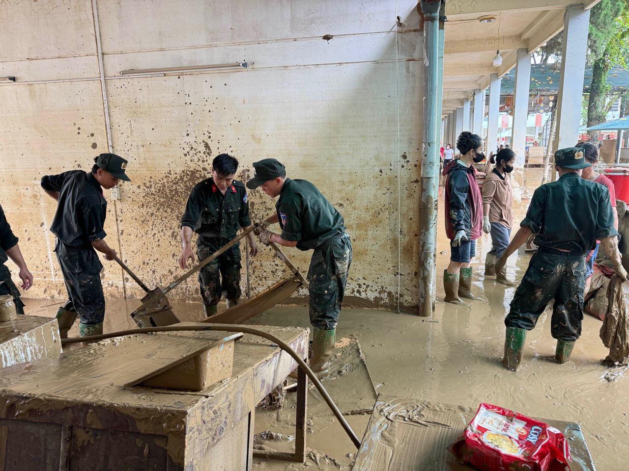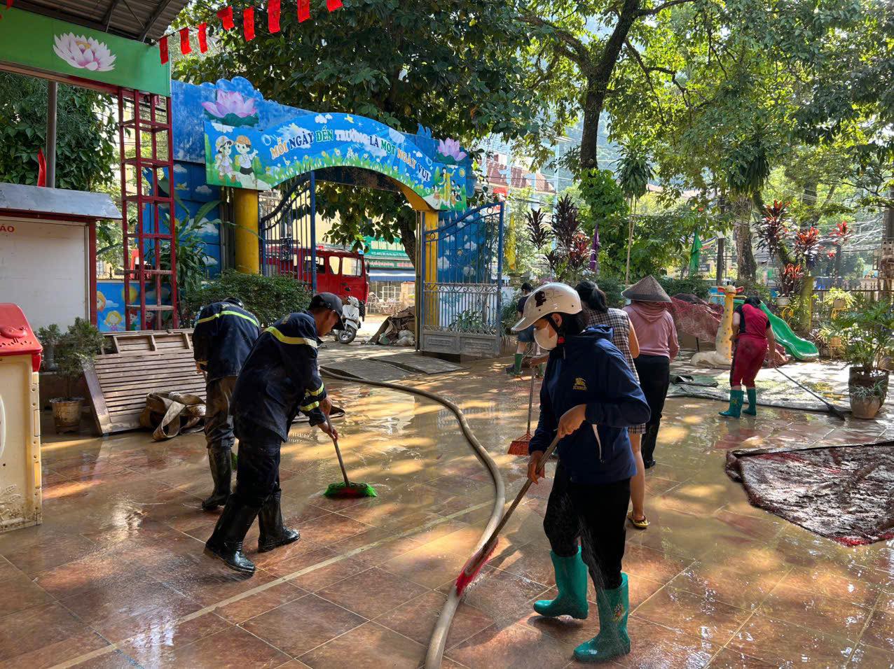 Một trong những nhiệm vụ được ưu tiên hàng đầu là hỗ trợ giáo viên dọn dẹp bùn đất tại các trường học bị ngập lụt để học sinh sớm trở lại lớp. Bão lũ đi qua đã khiến nhiều trường học trên địa bàn phường Hà Giang 1 và phường Hà Giang 2 như: Trường Mầm non Hoa Sen, Trường Tiểu học Minh Khai, Trường Tiểu học Quang Trung, Trường PTDT nội trú tỉnh… bị ảnh hưởng nặng nề, cơ sở vật chất hư hỏng, cây cối gãy đổ, sân trường và lớp học ngập bùn đất.