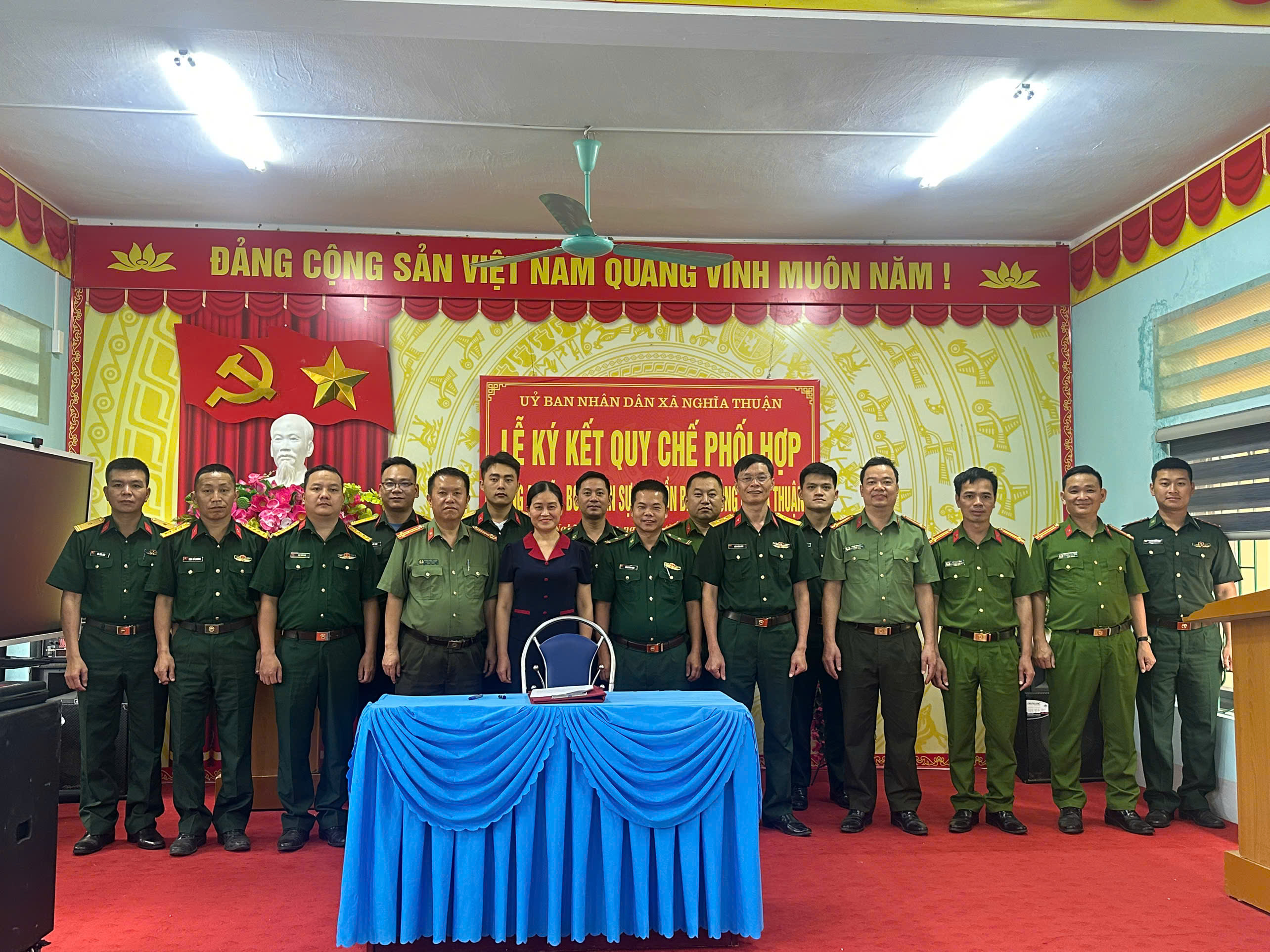 Phát biểu chỉ đạo tại buổi lễ, đồng chí Đặng Thị Hưởng, Phó Bí thư Đảng ủy, Chủ tịch UBND xã Nghĩa Thuận nhấn mạnh: Việc ký kết quy chế không chỉ là thủ tục hành chính mà là cơ sở pháp lý quan trọng để ba lực lượng phát huy sức mạnh tổng hợp. Trong bối cảnh tình hình mới có nhiều diễn biến phức tạp, sự gắn kết giữa "lá chắn" và "thanh gươm" sẽ đảm bảo môi trường hòa bình, ổn định cho sự phát triển kinh tế - xã hội của địa phương. Sự phối hợp chặt chẽ giữa Công an, Quân sự và Biên phòng là nhân tố quyết định để xây dựng thế trận an ninh nhân dân gắn với thế trận quốc phòng toàn dân vững mạnh, bảo vệ vững chắc chủ quyền biên giới và bình yên nội địa.