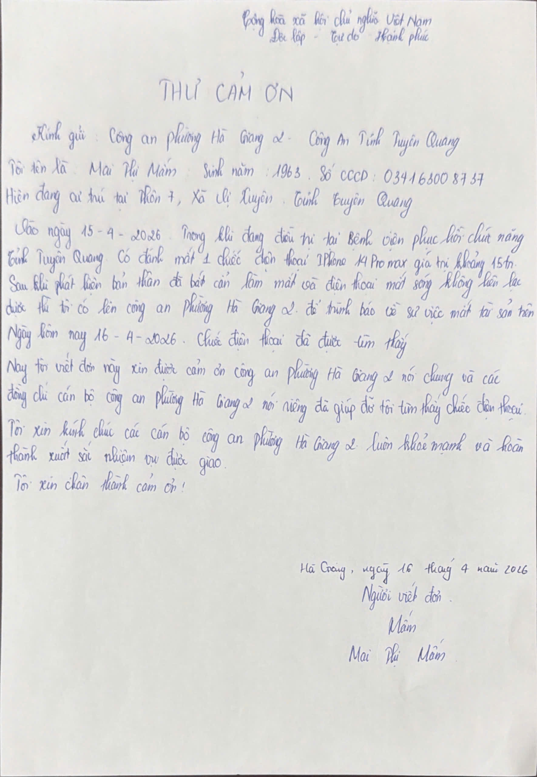 Theo nội dung bức thư, vào ngày 15/04/2026 bà Mấm đang điều trị tại Bệnh viện phục hồi chức năng tỉnh Tuyên Quang thì phát hiện bị mất 01 (một) chiếc điện thoại di động, nhãn hiệu Iphone 14 Promax trị giá khoảng 15.000.000đ (Mười lăm triệu đồng). Do không liên lạc được số thuê bao và tìm được điện thoại nên bà Mấm đã đến Công an phường Hà Giang 2 trình báo sự việc và nhờ tìm lại tài sản.