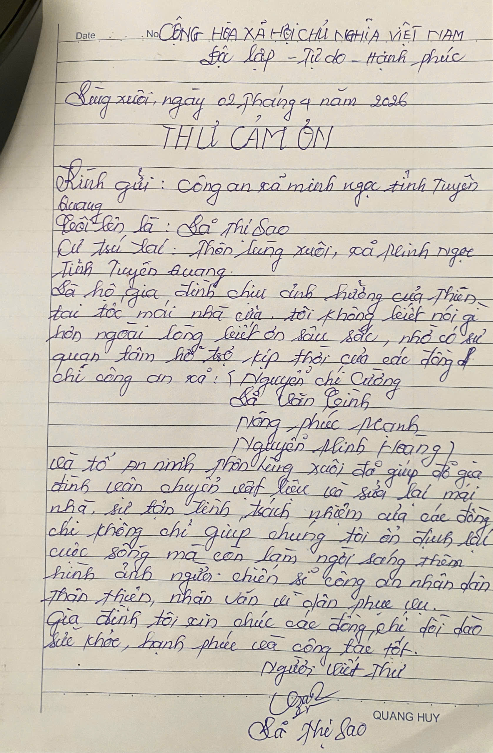 Xúc động trước sự quan tâm, giúp đỡ kịp thời đó, Chị Lã Thị Sao, trú tại thôn Lùng Xuôi, xã Minh Ngọc đã gửi thư cảm ơn tới Công an xã Minh Ngọc. Trong thư gia đình đã bày tỏ sự trân trọng trước tinh thần trách nhiệm, sự tận tâm của lực lượng Công an xã đã không quản khó khăn, vất vả, kịp thời giúp gia đình di chuyển vật liệu, sửa chữa lại mái nhà bị hư hỏng do thiên tai.