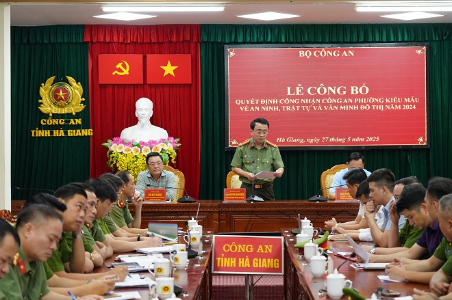 Ngày 27/5, Công an tỉnh tổ chức lễ công bố và trao quyết định của Bộ trưởng Bộ Công an công nhận Công an phường kiểu mẫu về an ninh trật tự và văn minh đô thị năm 2024 cho Công an phường Nguyễn Trãi, thành phố Hà Giang. Dự buổi lễ có đồng chí Đại tá Nguyễn Mạnh Hùng - Ủy viên BTV Đảng uỷ, Phó Giám đốc Công an tỉnh; Đồng chí Bùi Huy Hoàng – Phó Bí thư Thường trực Thành ủy; Đồng chí Trần Song Hà – Phó Chủ tịch UBND Thành phố cùng các đồng chí Lãnh đạo các phòng, ban, đơn vị nghiệp vụ Công an tỉnh; Lãnh đạo VP UBND thành phố; Thường trực Đảng ủy, UBND phường Nguyễn Trãi.