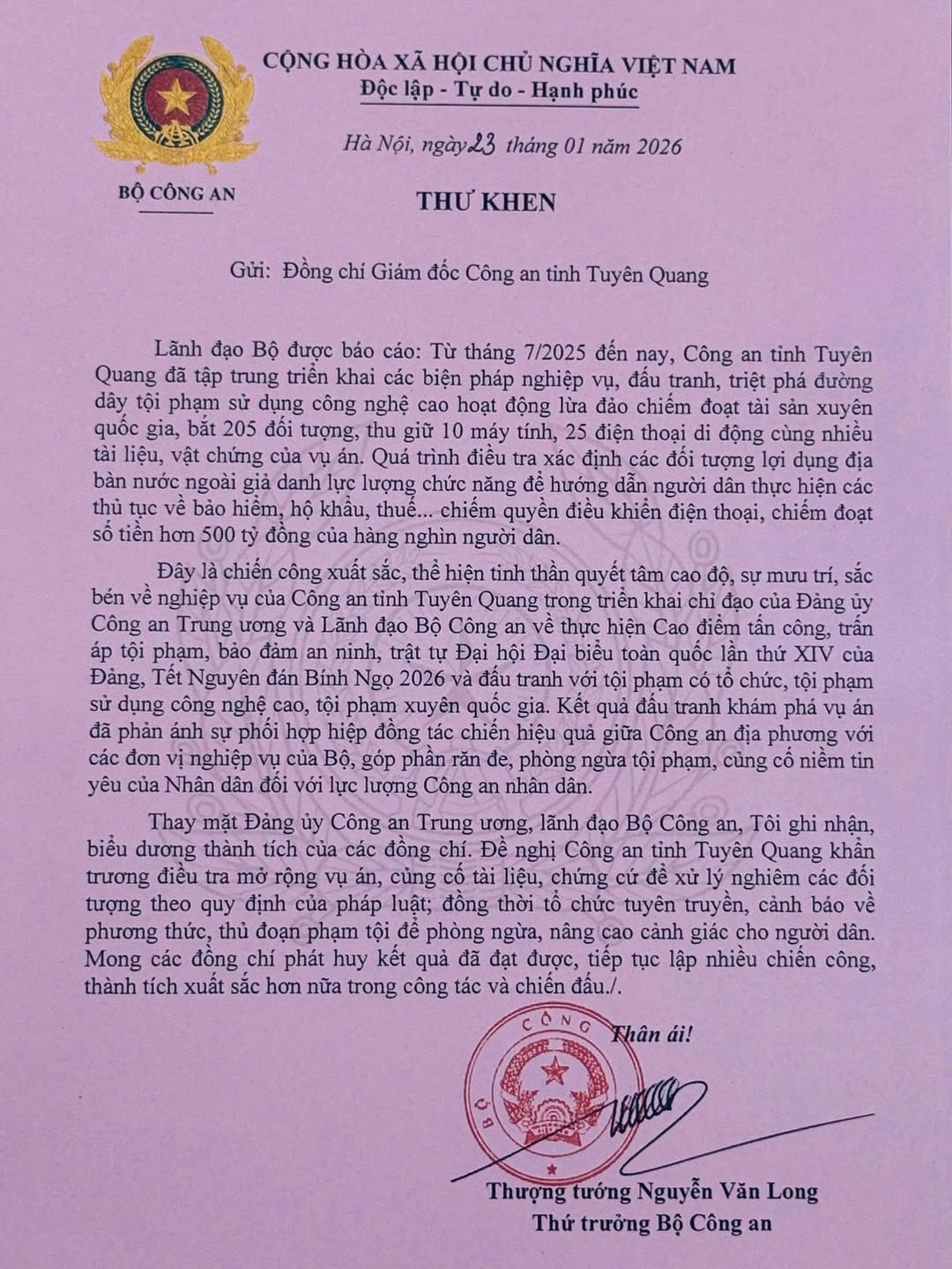 Thư khen của Thượng tướng Nguyễn Văn Long, Thứ trưởng Bộ Công an khen chiến công xuất sắc của Công an tỉnh Tuyên Quang đấu tranh phá thành công chuyên án đường dây lừa đảo tại Campuchia.