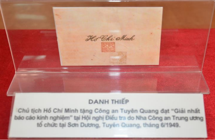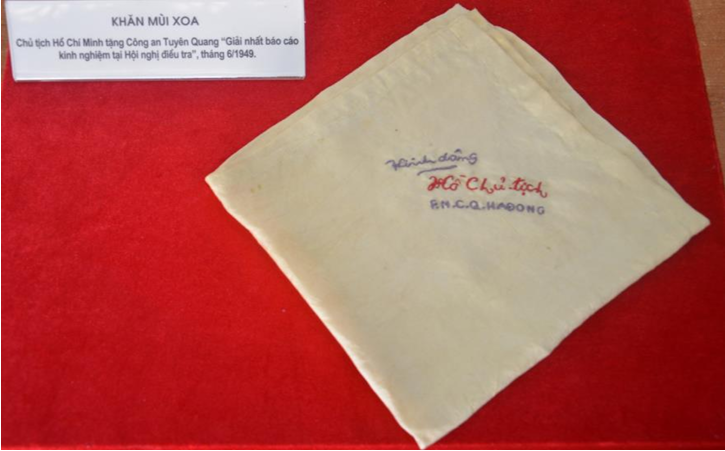 Chiếc khăn thêu và danh thiếp của Chủ tịch Hồ Chí Minh tặng Công an Tuyên Quang - Phần thưởng dành cho báo cáo hay nhất trình bày tại Hội nghị tác điều tra lần thứ I, năm 1949 (báo cáo do Văn phòng tham mưu xây dựng).