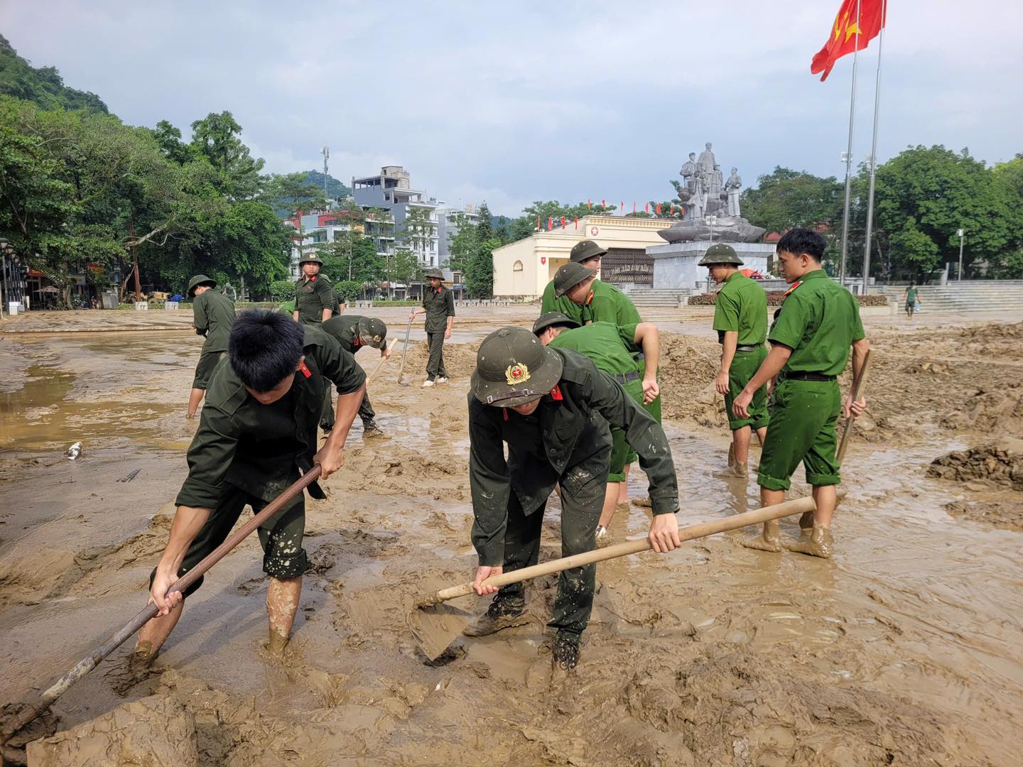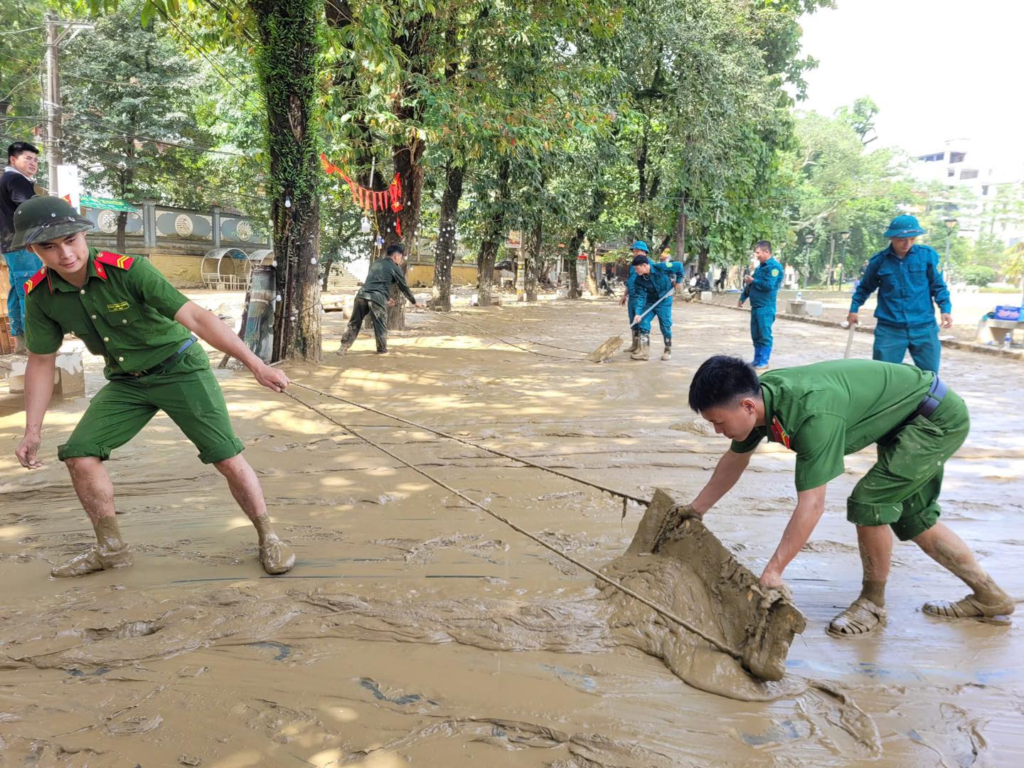 Ngay khi nước rút, lực lượng Công an triển khai thần tốc công tác khắc phục: dùng máy bơm công suất lớn bơm nước, vệ sinh từng phòng học, dọn sạch sân trường; dọn dẹp đường phố, dùng cuốc xẻng xúc đất, khơi thông dòng chảy, cống rãnh, đặc biệt tại các khu vực bùn lầy nặng như khu vực Quảng trường 26/3 và các trục đường chính, đảm bảo lưu thông trên các tuyến đường. Đồng thời, chuẩn bị sẵn sàng lực lượng, phương án ứng phó bão số 11, không để bị động, bất ngờ trong mọi tình huống.