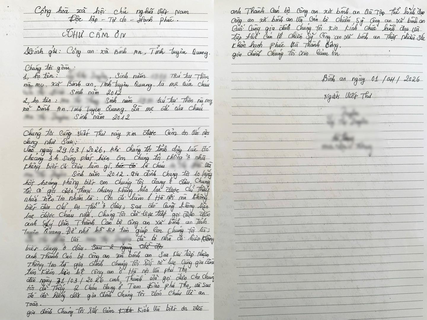 Trước đó, vào ngày 30/3/2026, Công an xã Bình An nhận được tin báo của gia đình về việc hai cháu L.T.Đ. và M.T.D. (đều sinh năm 2012, trú tại xã Bình An) bỏ nhà đi từ rạng sáng. Gia đình nhiều lần liên lạc nhưng các cháu không nghe máy, chỉ để lại một tin nhắn với nội dung: “Con đi làm ở Hà Nội”.