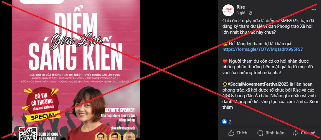 Thời gian gần đây, RISE đẩy mạnh quảng bá “Ngày hội phong trào xã hội năm 2025” (SMF 2025) tại Thái Lan với chủ đề: “Vững vàng trong thử thách: Dám sống – Dám thay đổi”; đây là chiêu trò tinh vi nhằm lợi dụng nhu cầu học hỏi, rèn luyện kỹ năng của giới trẻ thông qua phần mềm Zoom để chuyển hóa nhận thức, tuyên truyền xuyên tạc. Thông qua các khóa đào tạo, huấn luyện, RISE lồng ghép, xuyên tạc vấn đề dân chủ, nhân quyền, đưa thông tin tiêu cực về tình hình chính trị, xã hội trong nước, từng bước chuyển hóa quan điểm chính trị, kích động một bộ phận giới trẻ có nhận thức lệch lạc đứng lên phản kháng chủ trương, chính sách của Đảng, Nhà nước; thúc đẩy cái gọi là “phong trào chính trị”, “bất tuân dân sự” ở trong nước, qua đố tập hợp lực lượng tham gia hoạt động chống phá Đảng, Nhà nước. Đây là ý đồ, phương thức, thủ đoạn nằm trong chiến lược “diễn biến hòa bình” của các đối tượng, tổ chức phản động, chống đối.