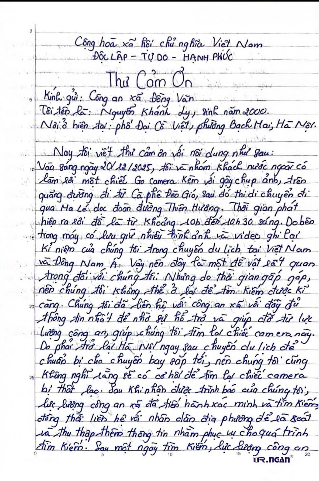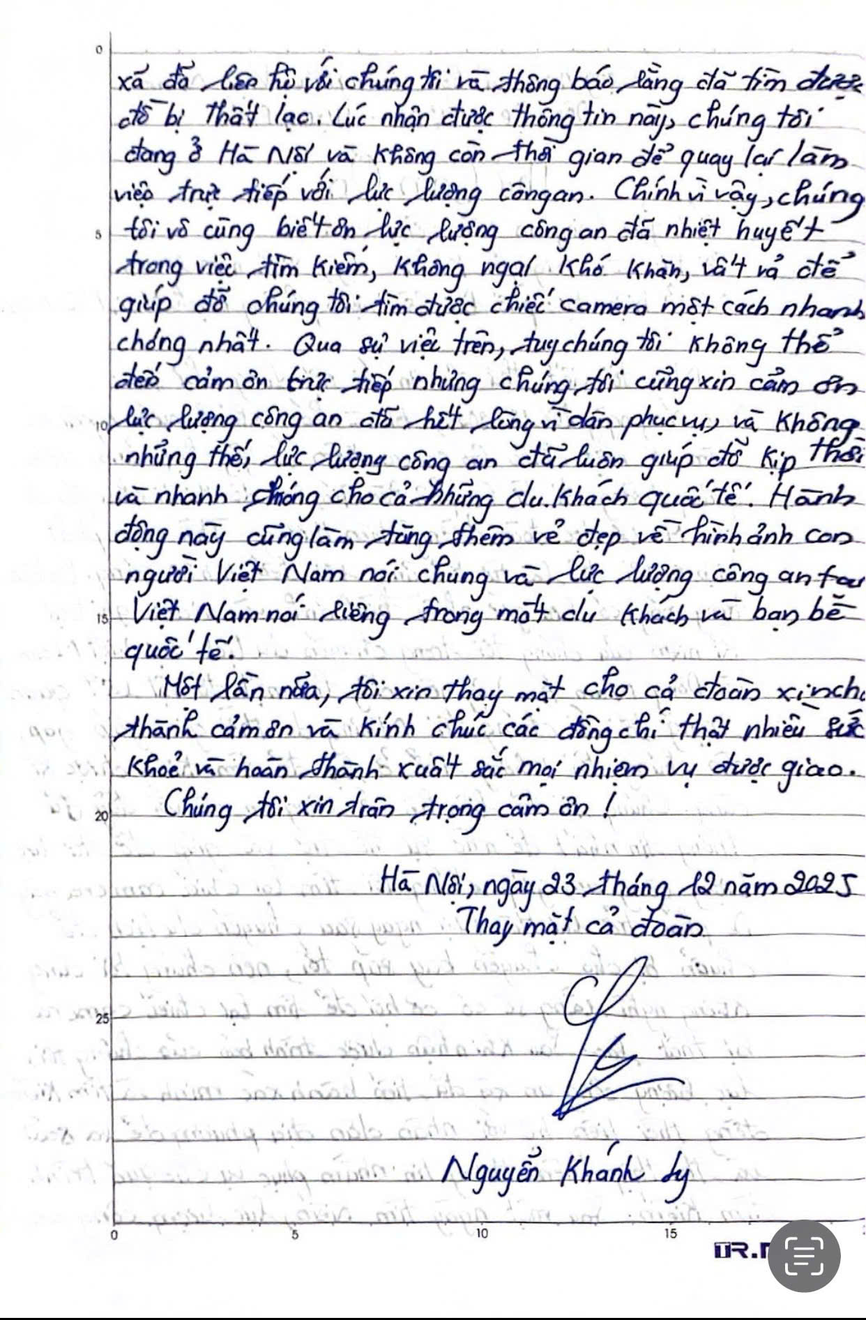 Tại buổi nhận lại tài sản, khách du lịch không giấu được sự xúc động, vui mừng. Đặc biệt, chị Ly đã viết thư cảm ơn gửi Công an xã Đồng Văn, bày tỏ sự trân trọng đối với tinh thần trách nhiệm, thái độ tận tụy, gần gũi của lực lượng Công an xã; đồng thời gửi lời cảm ơn chân thành tới anh Hoàng Quốc Tuệ – người đã có nghĩa cử cao đẹp, nhặt được của rơi và trả lại người đánh mất.