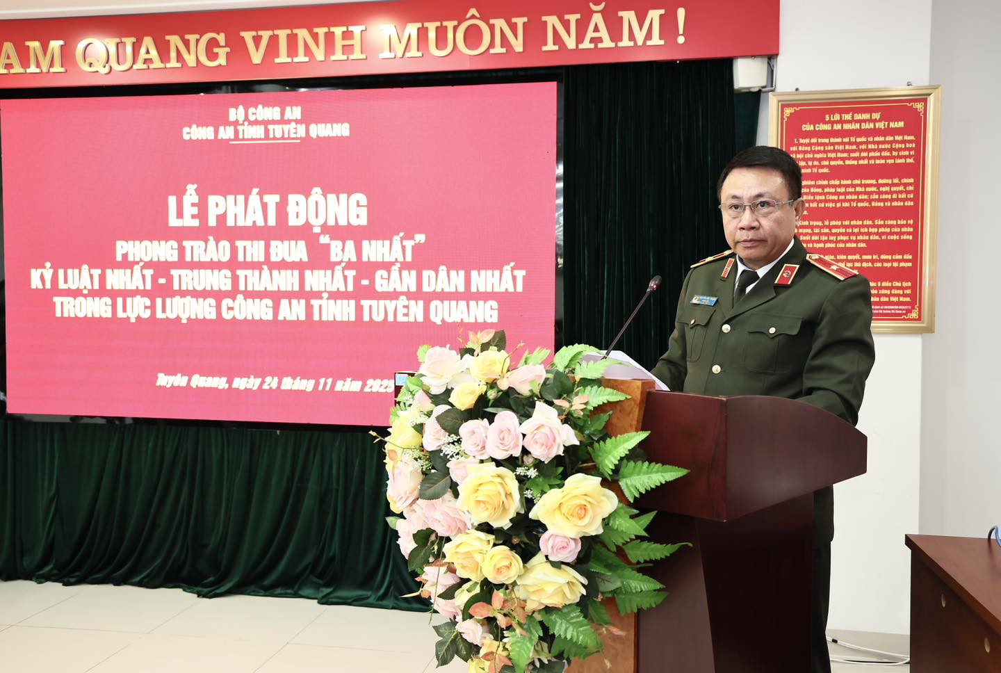 Tại buổi lễ, đồng chí Thiếu tướng Nguyễn Đức Thuận, Giám đốc Công an tỉnh đã phát động phong trào thi đua đặc biệt “Ba nhất: Kỷ luật nhất - Trung thành nhất - Gần dân nhất” trong lực lượng Công an tỉnh Tuyên Quang với chủ đề thi đua: “Kỷ luật là nền tảng - Trung thành là cốt lõi - Gần dân là thước đo” và phương châm hành động: “Lấy thi đua “Ba nhất” làm kim chỉ nam, biến ý chí thành hành động, mỗi cá nhân tiến bộ hơn, mỗi tập thể vững mạnh hơn”. Đồng chí đề nghị các đơn vị cần nêu cao tinh thần trách nhiệm, bám sát các nội dung đợt thi đua, bảo đảm thiết thực, hiệu quả; quá trình tổ chức thực hiện yêu cầu cấp uỷ, lãnh đạo mỗi đơn vị phải tập trung chỉ đạo, đôn đốc thường xuyên, quyết liệt; phát huy truyền thống vẻ vang anh hùng, đoàn kết, chủ động, sáng tạo, khắc phục mọi khó khăn, quyết tâm hoàn thành vượt mức các chỉ tiêu, nhiệm vụ phong trào thi đua.