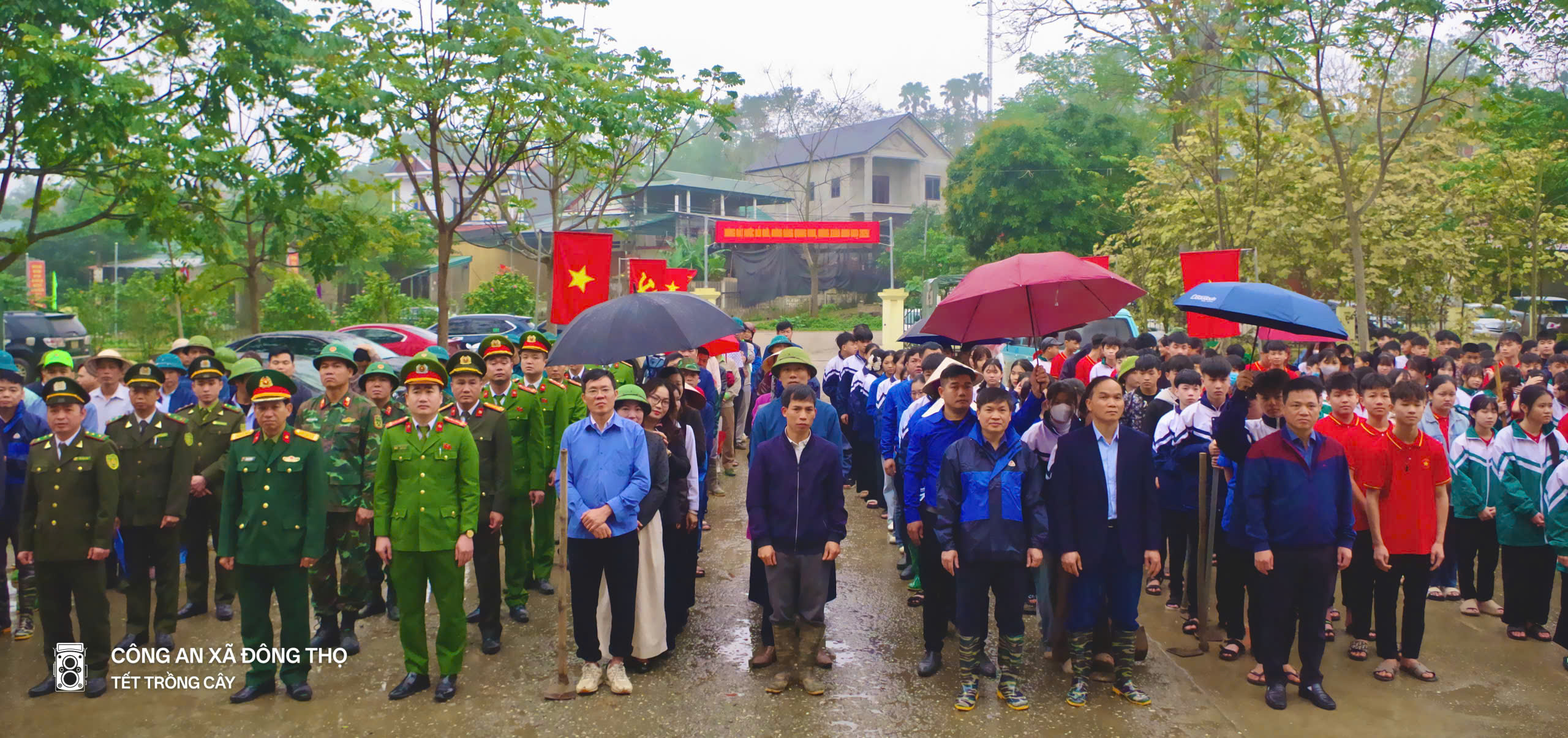 Trong màn mưa xuân lất phất, hình ảnh những bộ sắc phục Công an, Quân sự, Kiểm lâm hòa cùng màu áo xanh tình nguyện và đồng phục học sinh đã tạo nên một bức tranh sinh động, thể hiện tinh thần đoàn kết, chung tay vì môi trường. Từng hố đất được đào, từng cây xanh được trồng xuống không chỉ góp phần phủ xanh quê hương mà còn lan tỏa thông điệp mạnh mẽ về trách nhiệm bảo vệ thiên nhiên.