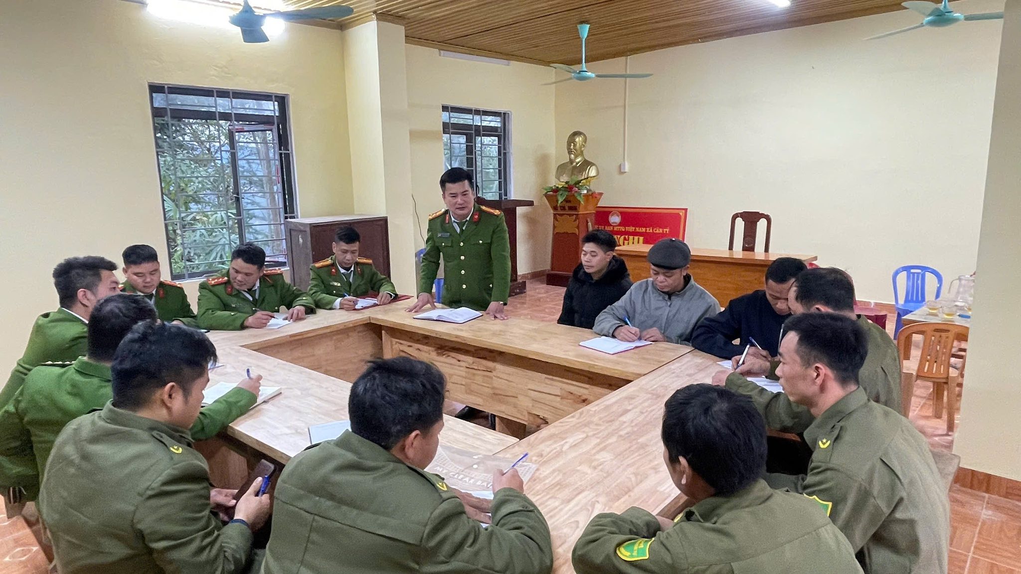Buổi làm việc có sự chủ trì của đồng chí Thượng tá Hoàng Trung Dũng – Trưởng Công an xã, đồng chí Trung tá Vàng Mí Lùng - Phó trưởng Công an xã cùng cán bộ phụ trách địa bàn; tham dự có đại diện Ban Quản lý phát triển thôn (BQLPT) và Tổ ANTTCS hai thôn. Việc tổ chức giao ban trực tiếp tại cơ sở đã tạo điều kiện thuận lợi để trao đổi thông tin hai chiều, đánh giá sát thực tế tình hình địa bàn.