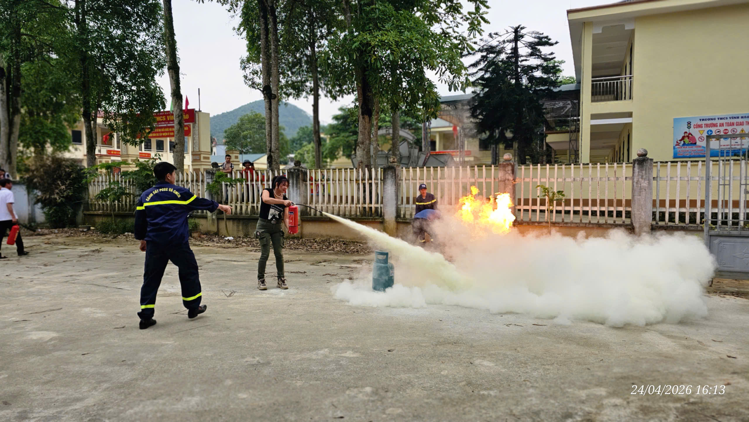 Bên cạnh phần lý thuyết, lực lượng chức năng còn trực tiếp hướng dẫn thực hành sử dụng bình chữa cháy xách tay, thao tác xử lý các tình huống cháy giả định nhằm giúp học viên nâng cao kỹ năng ứng phó khi có sự cố xảy ra.