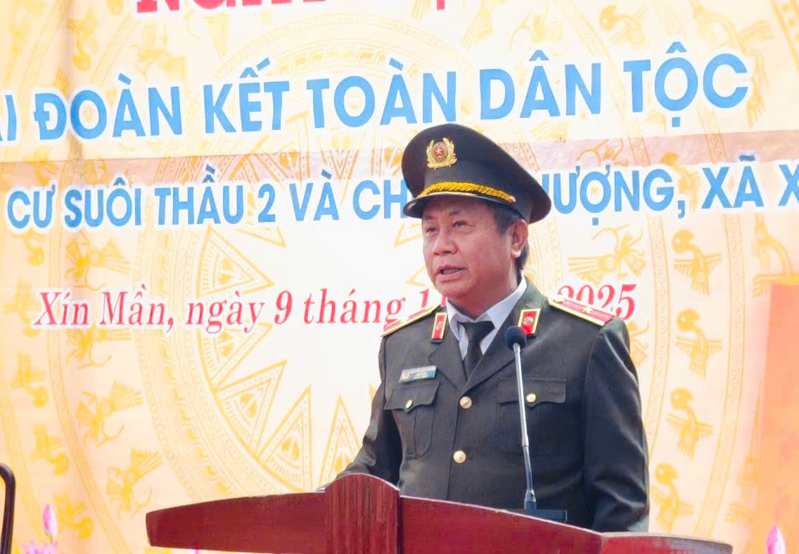 Phát biểu tại Ngày hội, Thiếu tướng Nguyễn Đức Thuận bày tỏ niềm vui mừng, phấn khởi trước những đổi thay trong đời sống của Nhân dân xã Xín Mần nói chung, liên khu dân cư Suôi Thầu 2 và Chí Cà Thượng nói riêng. Đồng chí đề nghị cấp uỷ, chính quyền xã tiếp tục phát huy vai trò của Mặt trận Tổ quốc và các tổ chức đoàn thể trong việc củng cố khối đại đoàn kết toàn dân; đẩy mạnh phong trào Toàn dân bảo vệ An ninh Tổ quốc, gắn với xây dựng nông thôn mới; đoàn kết, hỗ trợ nhau phát triển kinh tế, xây dựng môi trường an ninh trật tự; tích cực tham gia xây dựng đời sống văn hoá, giữ gìn vệ sinh môi trường, xây dựng cảnh quan khu dân cư ngày càng sáng – xanh – sạch – đẹp, văn minh.