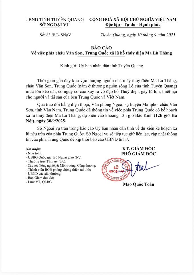 Thuỷ điện Trung Quốc ở thượng nguồn sông Lô dự kiến xả lũ vào 12h trưa nay 30/9