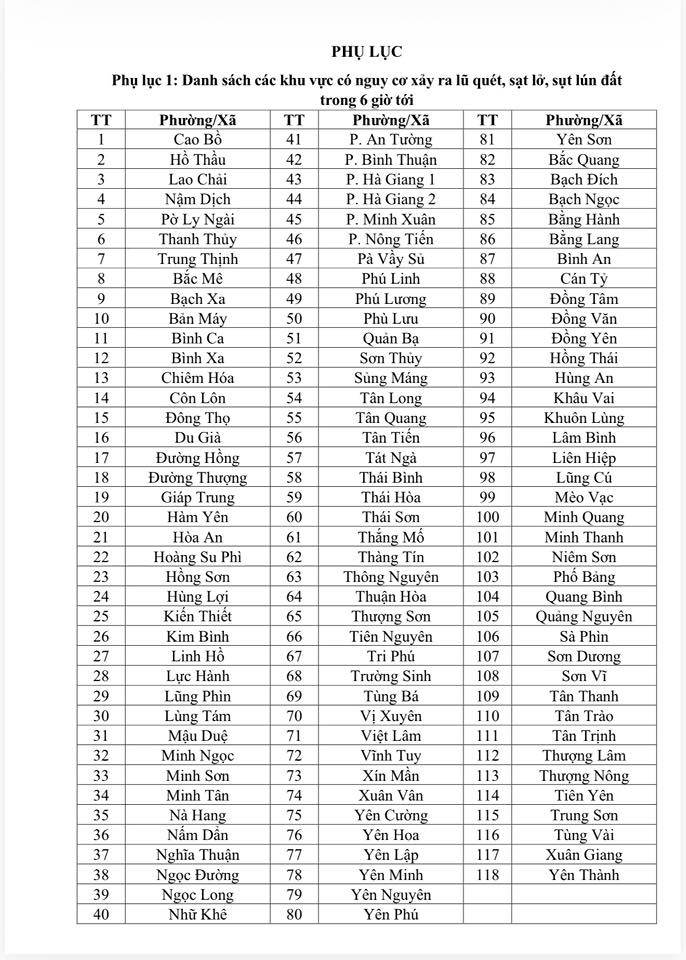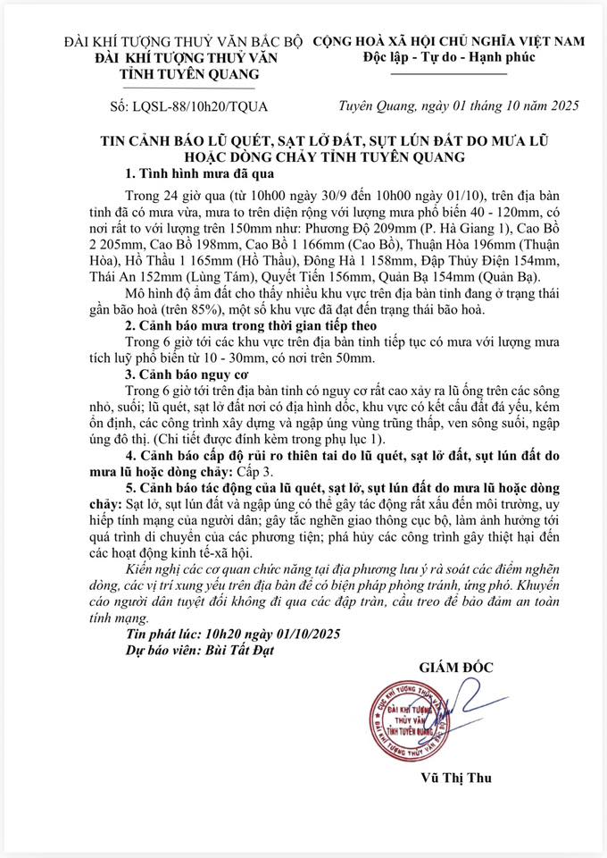 TIN CẢNH BÁO LŨ QUÉT, SẠT LỞ ĐẤT, SỤT LÚN ĐẤT DO MƯA LŨ HOẶC DÒNG CHẢY TRÊN TỈNH TUYÊN QUANG