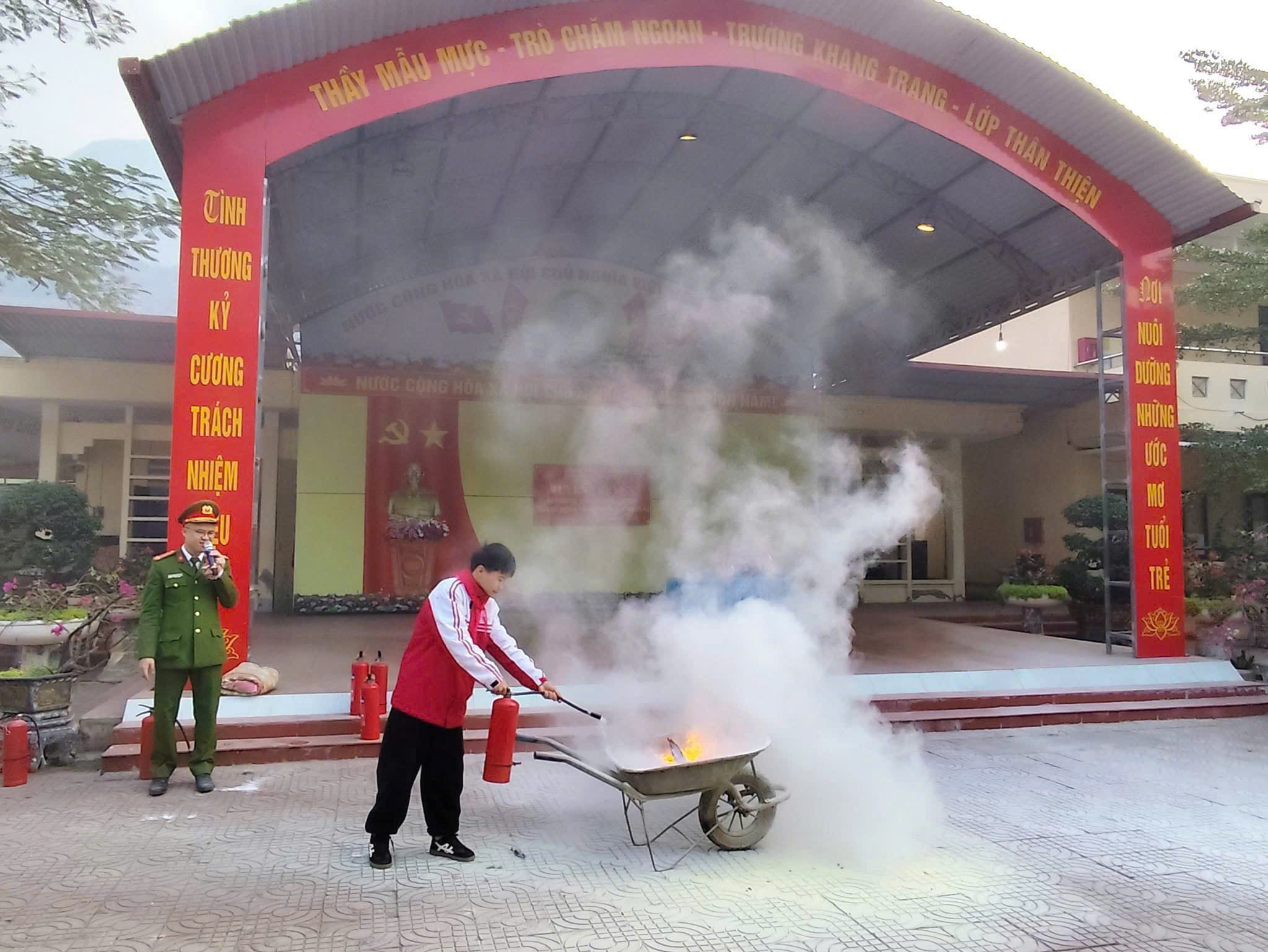 Bên cạnh đó, thầy cô giáo và học sinh được trải nghiệm thực hành sử dụng bình chữa cháy xách tay, kỹ năng thoát nạn, cứu người và sơ cứu ban đầu. Các em tham gia nghiêm túc, hào hứng, góp phần nâng cao ý thức phòng ngừa, bảo đảm an toàn cho bản thân và cộng đồng.