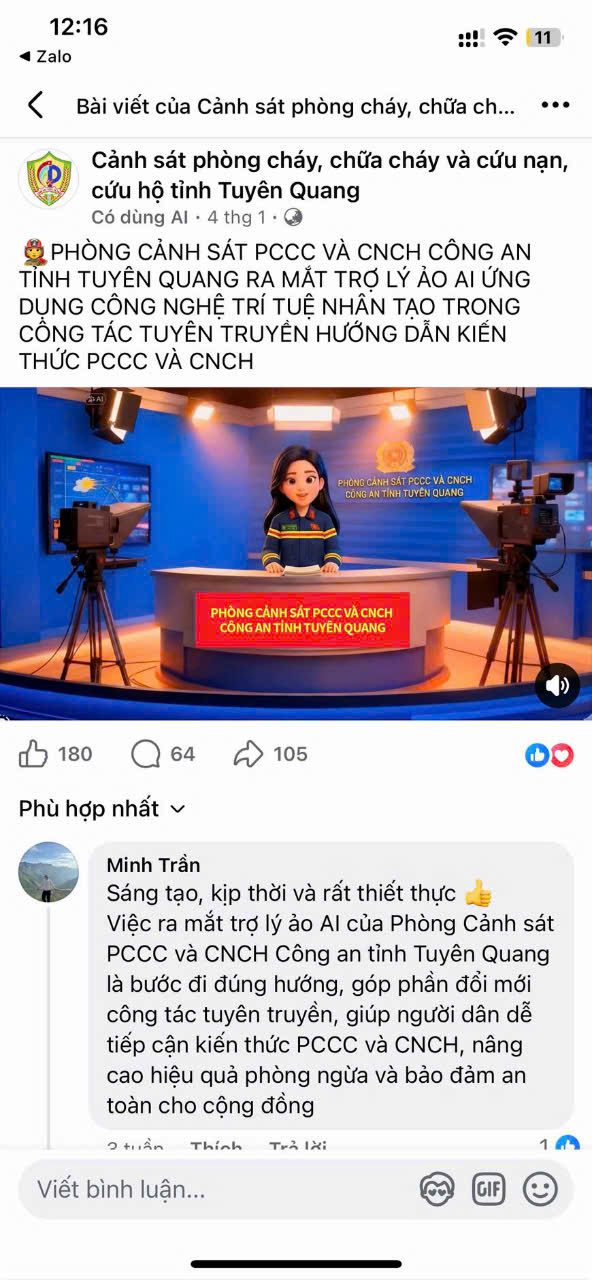 Thời gian gần đây, khi truy cập vào fanfage của Phòng Cảnh sát PCCC & CNCH Công an tỉnh Tuyên Quang người dân dễ dàng nhân thấy các sản phẩm tuyên truyền pháp luật đăng tải trên fanpage có nội dung gần gũi, dễ tiếp cận. Đặc biệt, việc ứng dụng AI trong xây dựng video, hình ảnh giúp thông tin trở nên sinh động, trực quan, tạo sức hút đối với người xem, nhất là giới trẻ.