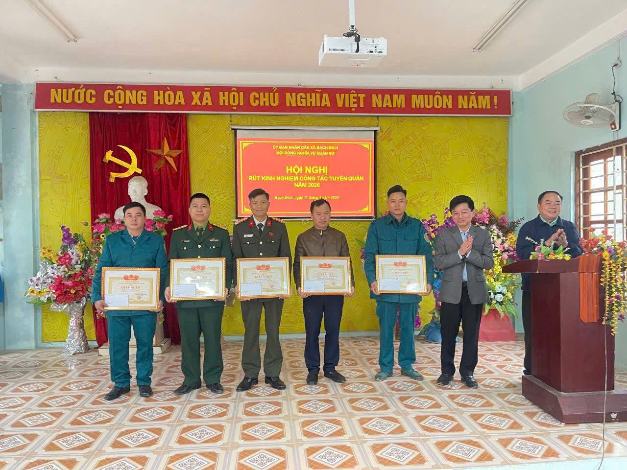 Nhân dịp này, xã Bạch Đích đã biểu dương, khen thưởng cho 5 tập thể 10 cá nhân có thành tích tiêu biểu trong công tác tuyển chọn và gọi công dân nhập ngũ năm 2026.