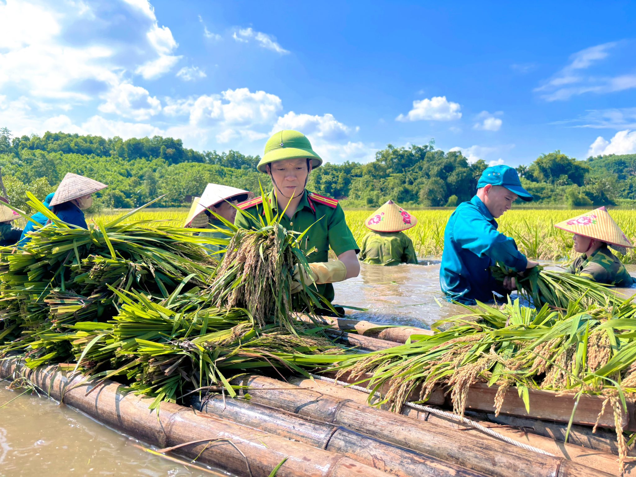 Không quản khó khăn, những cán bộ Công an xã Yên Phú cùng với Ban chỉ huy Quân sự xã và lực lượng dân quân đã xắn quần, lội nước, gặt lúa, vận chuyển đưa lúa về nhà ở cho nhân dân.