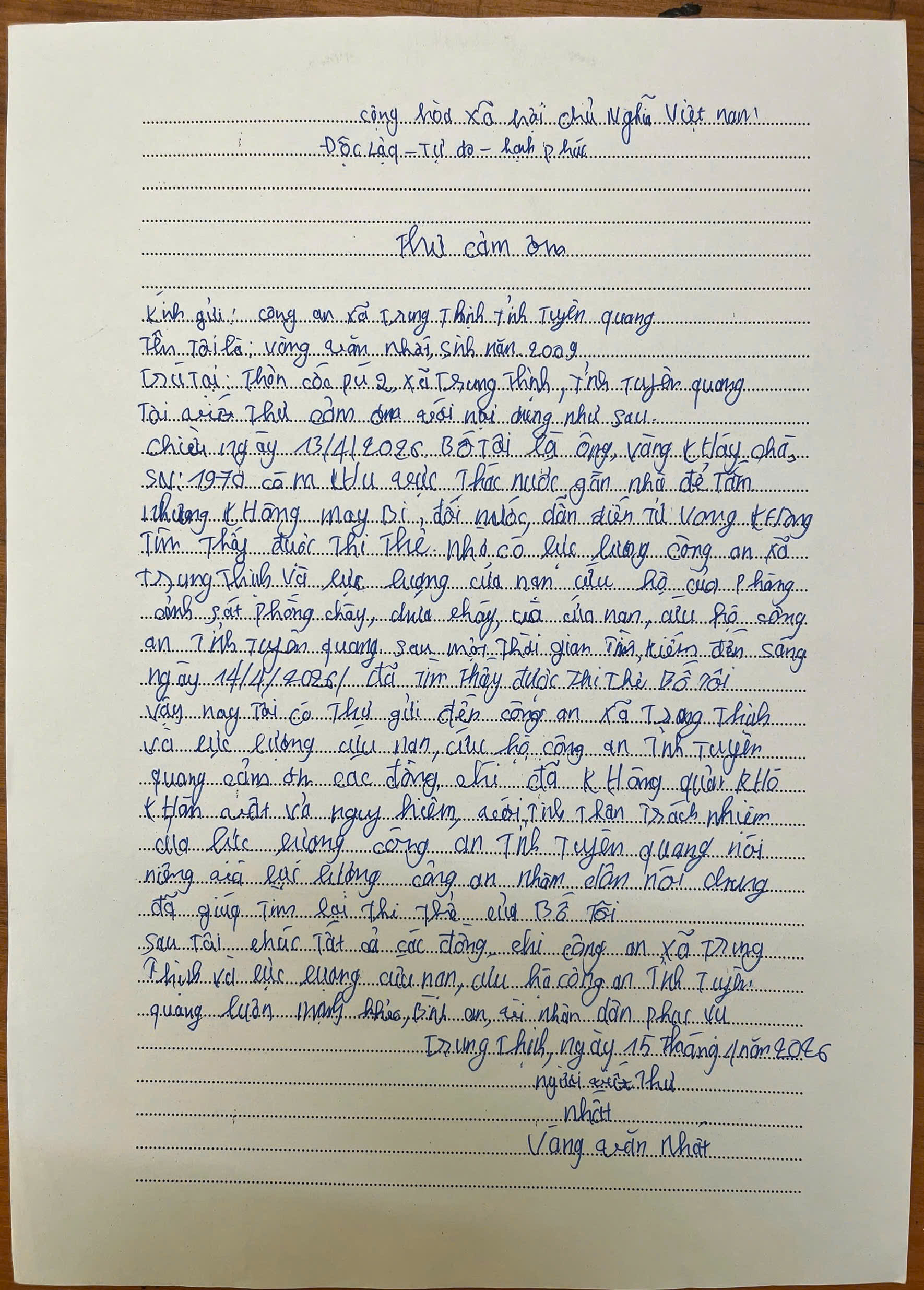 Đặc biệt, Sáng nay ngày 15/4/2026, Công an xã đã nhận được một lá thư tay đầy xúc động do con của nạn nhân gửi tới lực lượng Công an xã. Trong thư, em bày tỏ lòng biết ơn chân thành tới các cán bộ, chiến sĩ đã không quản ngại khó khăn, nguy hiểm, nỗ lực tìm kiếm, đưa thi thể người thân của em về với gia đình. Những dòng chữ mộc mạc, chân thành nhưng chứa đựng tình cảm sâu sắc đã khiến nhiều người không khỏi nghẹn ngào.
