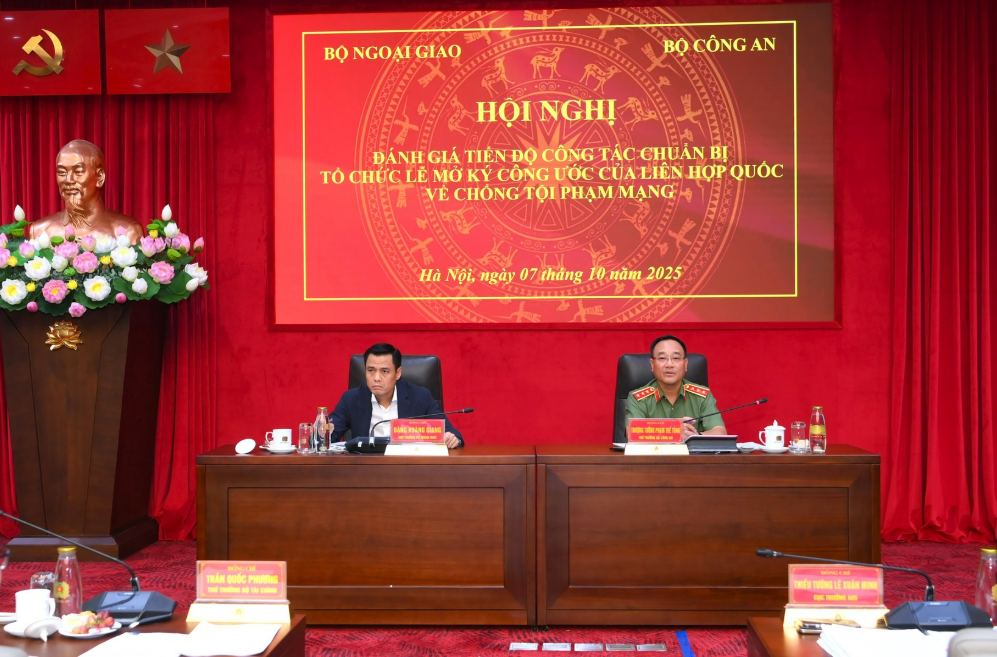 Chiều 07/10/2025, tại Hà Nội, Thượng tướng Phạm Thế Tùng, Thứ trưởng Bộ Công an, Trưởng Ban Chỉ đạo công tác chuẩn bị tổ chức Lễ mở ký Công ước của Liên hợp quốc về chống tội phạm mạng (Lễ mở ký Công ước) và đồng chí Đặng Hoàng Giang, Thứ trưởng Bộ Ngoại giao đồng chủ trì Hội nghị đánh giá tiến độ công tác chuẩn bị tổ chức Lễ mở ký Công ước.