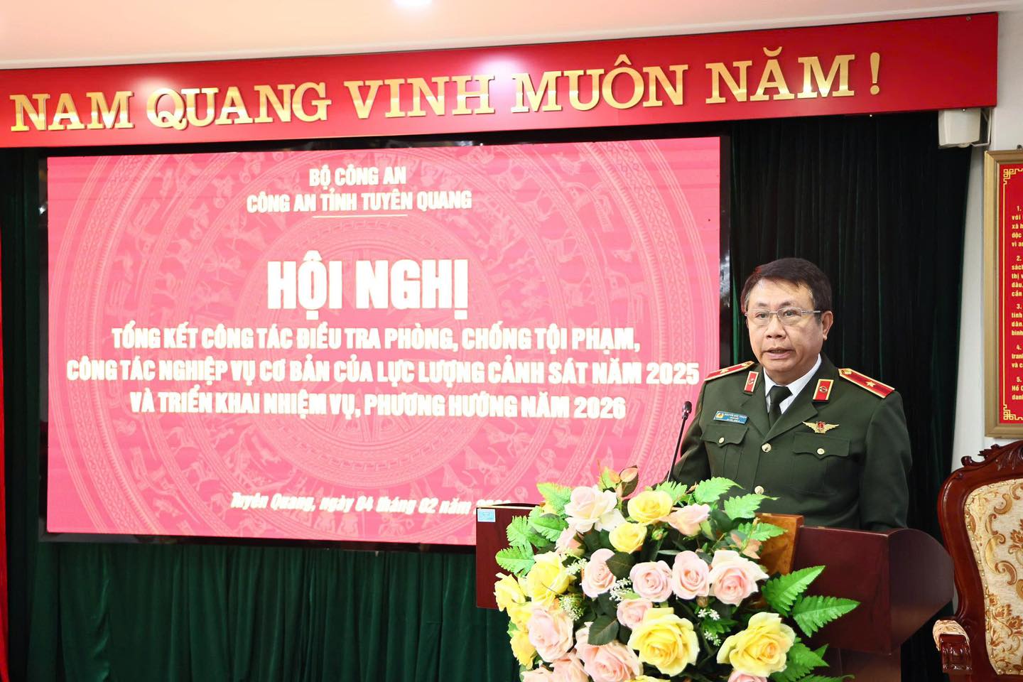 Sáng ngày 04/2/2026, Công an tỉnh Tuyên Quang tổ chức Hội nghị tổng kết công tác điều tra phòng chống tội phạm, công tác nghiệp vụ cơ bản của lực lượng Cảnh sát năm 2025 và triển khai nhiệm vụ, phương hướng năm 2026. Đồng chí Thiếu tướng Nguyễn Đức Thuận, Uỷ viên Ban Thường vụ Tỉnh uỷ, Bí thư Đảng uỷ, Giám đốc Công an tỉnh dự và chỉ đạo hội nghị. Đồng chí Đại tá Ma Quang Trung, Uỷ viên Ban BCH Đảng bộ, Phó Giám đốc, Thủ trưởng Cơ quan Cảnh sát điều tra Công an tỉnh chủ trì hội nghị; dự hội nghị có các đồng chí trong Ban Giám đốc Công an tỉnh.