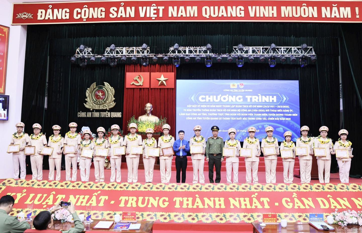 Chiều ngày 26/3/2026, Công an tỉnh Tuyên Quang tổ chức Chương trình gặp mặt kỷ niệm 95 năm Ngày thành lập Đoàn TNCS Hồ Chí Minh; đối thoại giữa Đảng uỷ, lãnh đạo Công an tỉnh, Thường trực Tỉnh đoàn với đoàn viên thanh niên và tuyên dương thanh niên Công an tỉnh Tuyên Quang có thành tích xuất sắc trong công tác, chiến đấu năm 2025. Đồng chí Thiếu tướng Nguyễn Đức Thuận, Uỷ viên Ban Thường vụ Tỉnh uỷ, Bí thư Đảng uỷ, Giám đốc Công an tỉnh cùng các đồng chí trong Đảng uỷ, lãnh đạo Công an tỉnh dự chương trình. Tham dự có đồng chí Hoàng Thế Hanh, Phó Bí thư Tỉnh đoàn, Trưởng ban Công tác Đoàn và thanh thiếu nhi tỉnh.