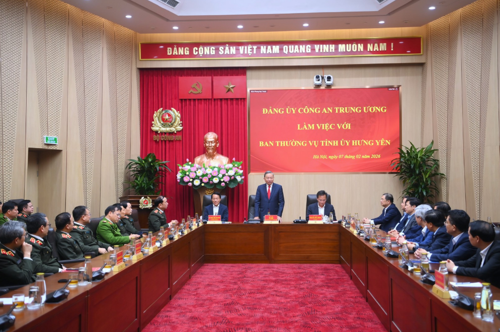 Chiều 07/02/2026, tại Hà Nội, Tổng Bí thư Tô Lâm đến dự và phát biểu tại buổi làm việc của Đảng ủy Công an Trung ương với Ban Thường vụ Tỉnh ủy Hưng Yên.